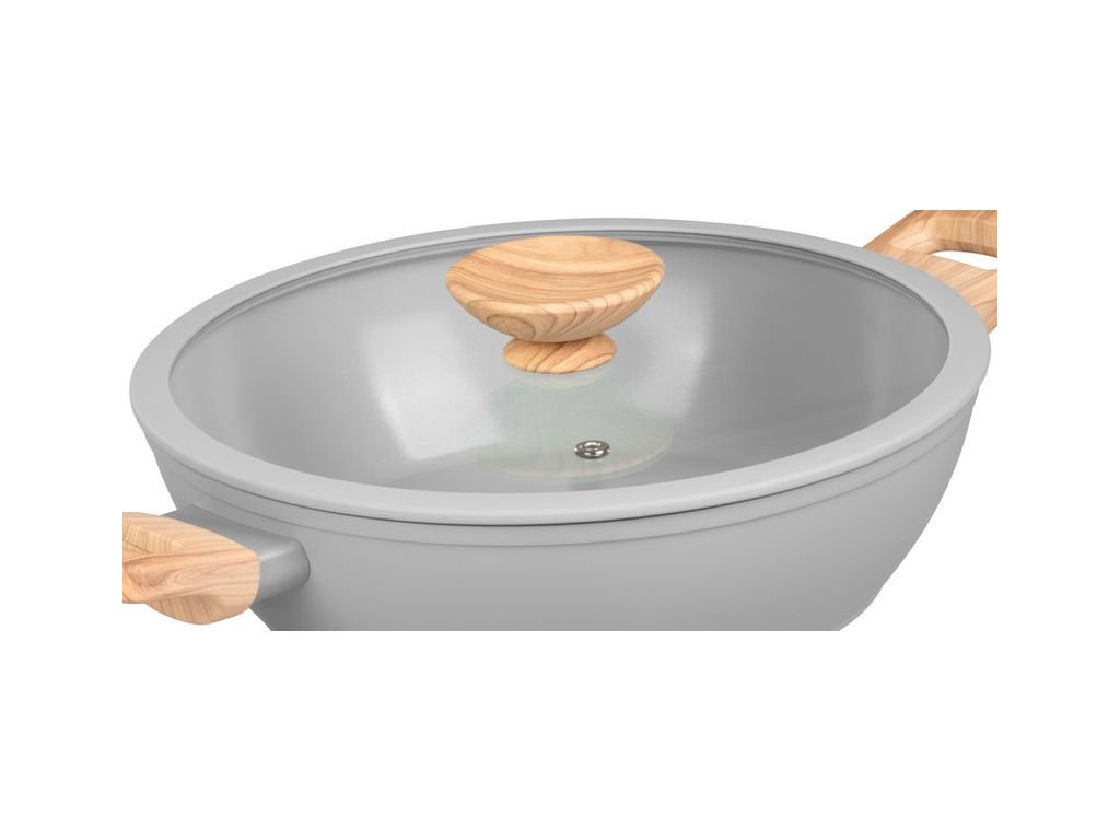 - Poklop: průhledná skleněná poklice s designovým dřevěným úchytem