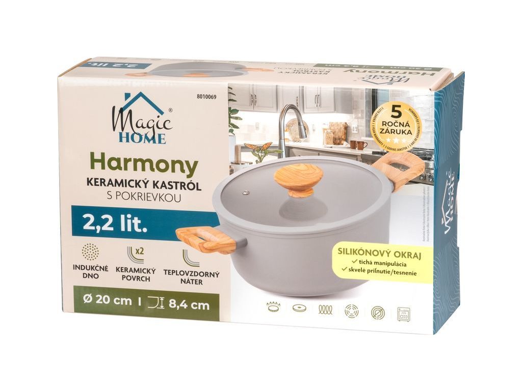 Kvalitní keramický kastrol MagicHome Harmony o objemu 2,2 litru a průměru 20 cm je ideální pro každodenní vaření v každé domácnosti. Díky modernímu designu, odolné konstrukci a praktickým detailům se stane neodmyslitelnou součástí vaší kuchyně.