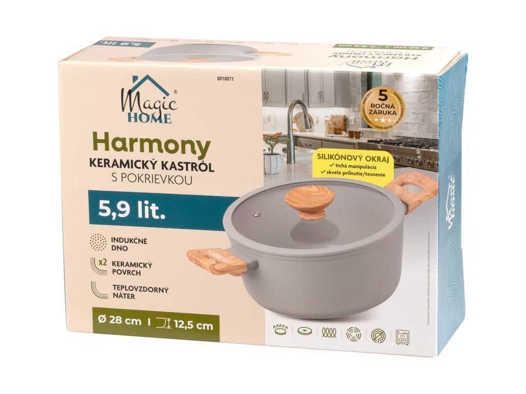 Kastrol MagicHome Harmony o průměru 28 cm a výšce 12,5 cm je ideální pro každodenní vaření. Díky skleněné poklici s praktickým dřevěným úchytem, indukčnímu dvojitému dnu a keramickému povrchu vám zaručí rovnoměrné rozložení tepla a snadnou údržbu.