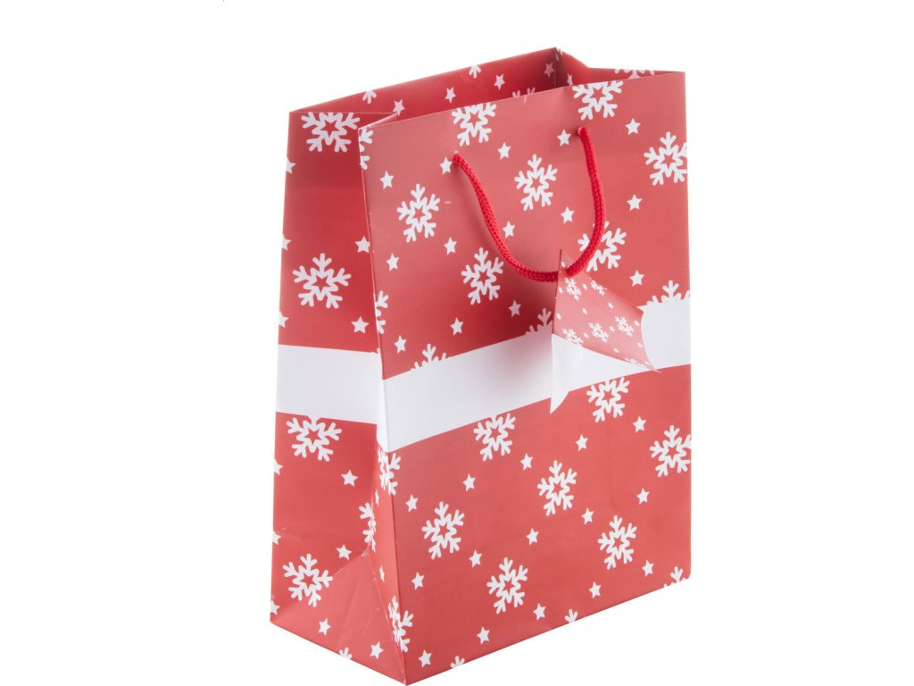 Matná laminovaná papírová dárková taška s vánočním designem, bílou tiskovou plochou a visačkou.