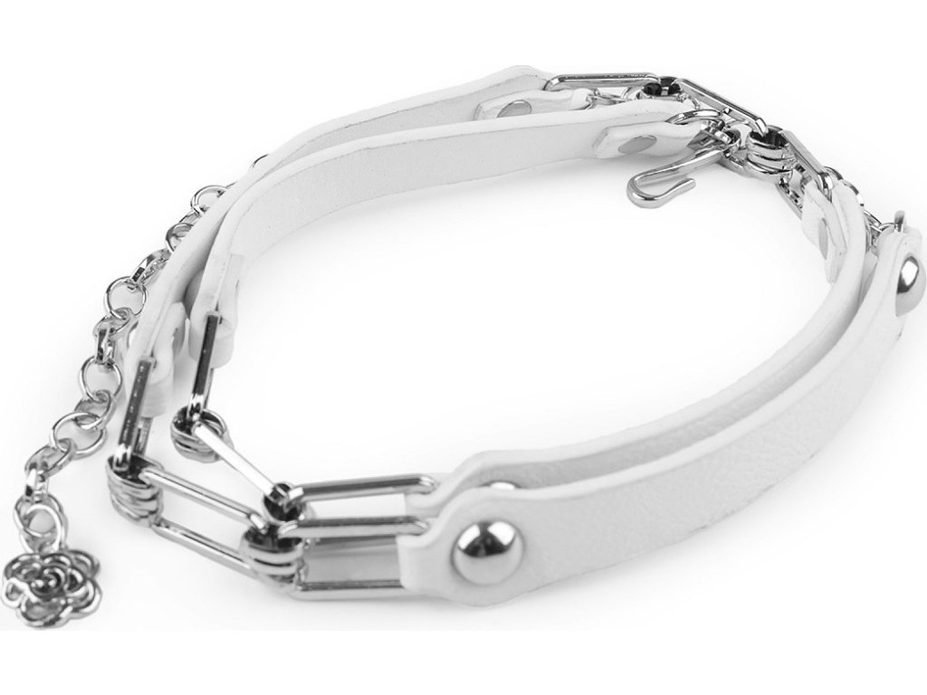 Dámský kombinovaný pásek patří k poutavým módním doplňkům. Je vytvořený z řetězu s plochými oky, který je propletený páskem z imitace kůže. Využijete jej k šatům, tunikám apod. Zapíná se karabinou, která je na jednom konci řetězu. Druhý konec je ozdobený přívěskem srdce. Nejmenší obvod zapnutého pásku je 80 cm, maximální obvod je 110 cm.