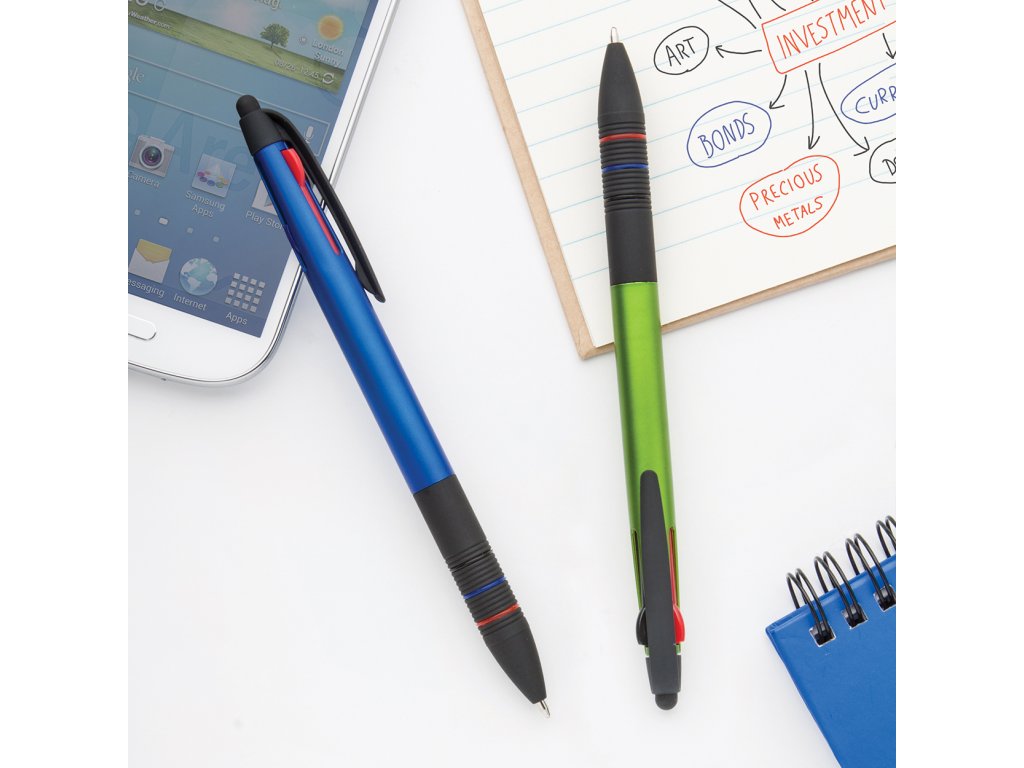 Plastové kuličkové a dotykové pero s pogumovaným úchopem a tělem s matnou metalickou úpravou. Tři barevné náplně: modrá, černá a červená.