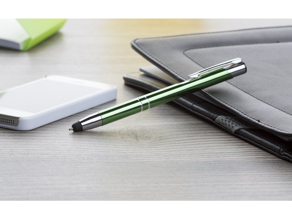 Hliníkové kuličkové pero s dotykovým koncem a modrou náplní.
