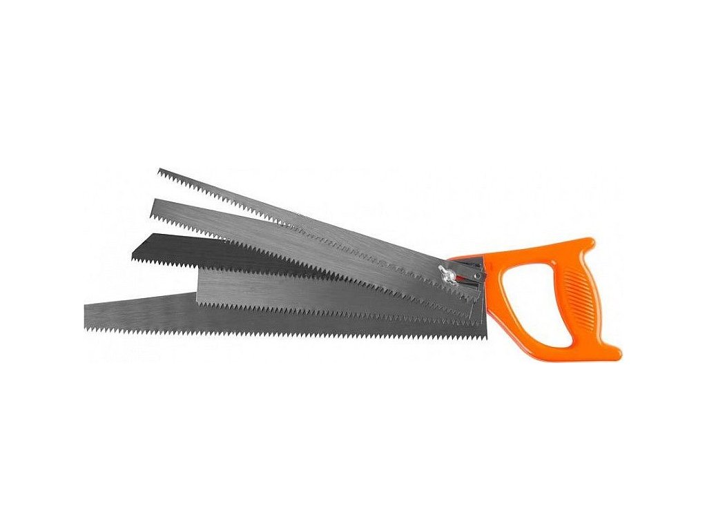Multifunkční ruční pilka s vyměnitelnými plátky. Pilku lze díky tomu použít k řezání kovu i dřeva.