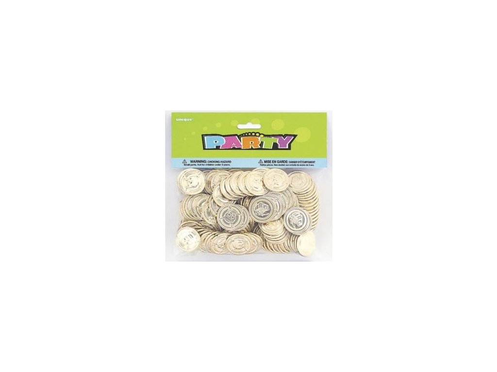Zlaté plastové mince se znakem lebky a pokladu je skvělá dekorace i odměna pro malé i velké dobrodruhy.