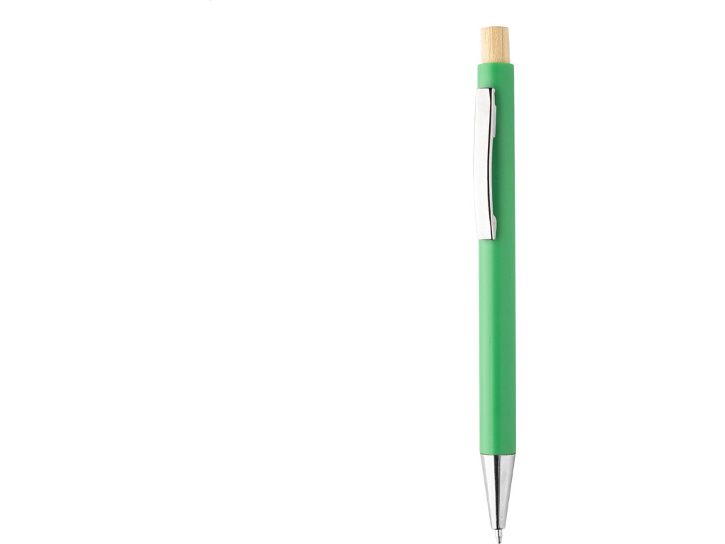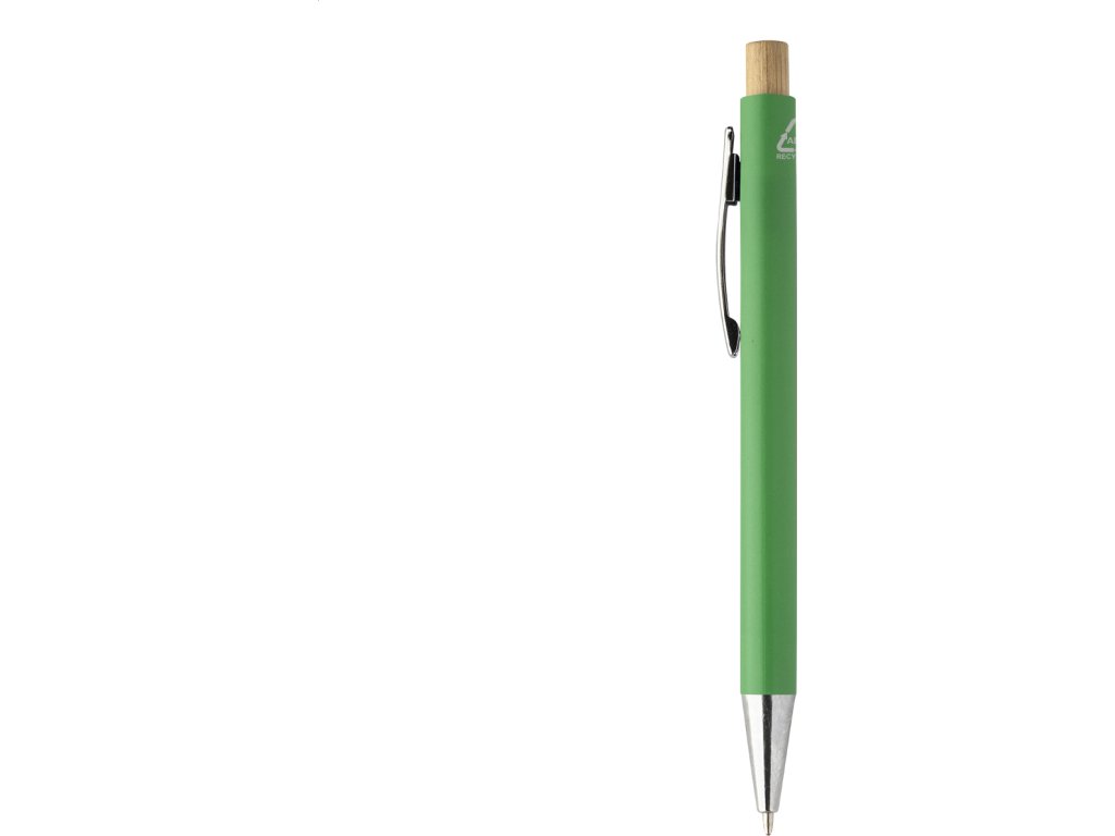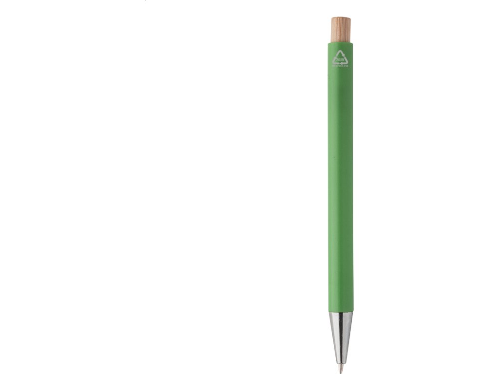 Kuličkové pero z recyklovaného ABS plastu s bambusovým tlačítkem a kovovým klipem. S modrou náplní.