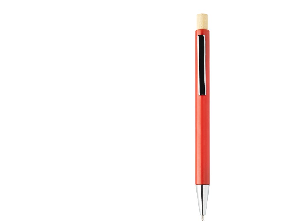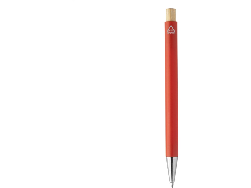 Kuličkové pero z recyklovaného ABS plastu s bambusovým tlačítkem a kovovým klipem. S modrou náplní.