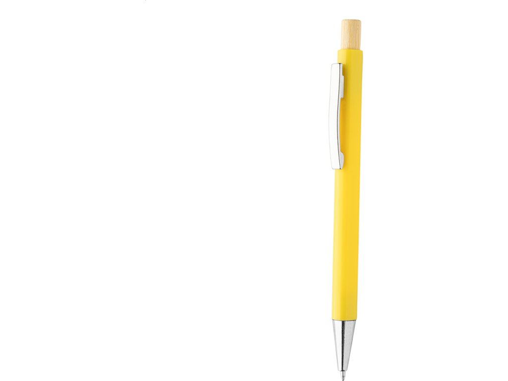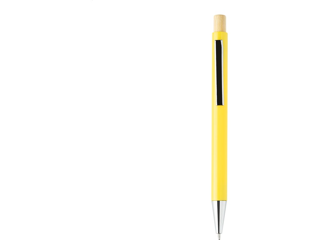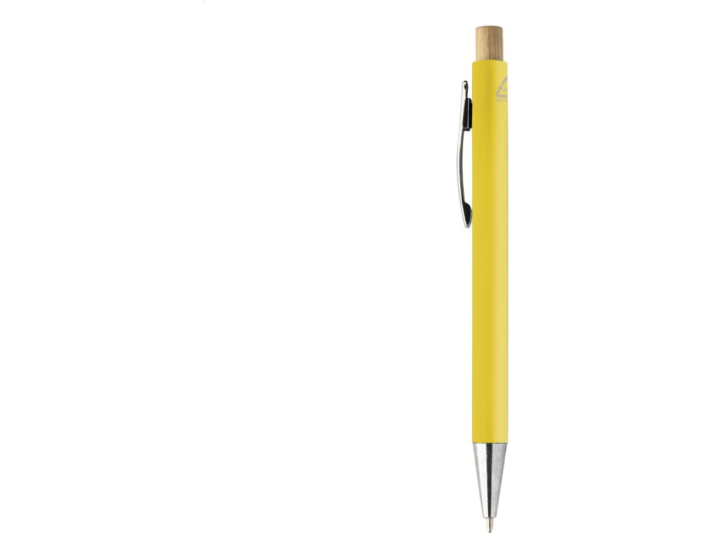 Kuličkové pero z recyklovaného ABS plastu s bambusovým tlačítkem a kovovým klipem. S modrou náplní.