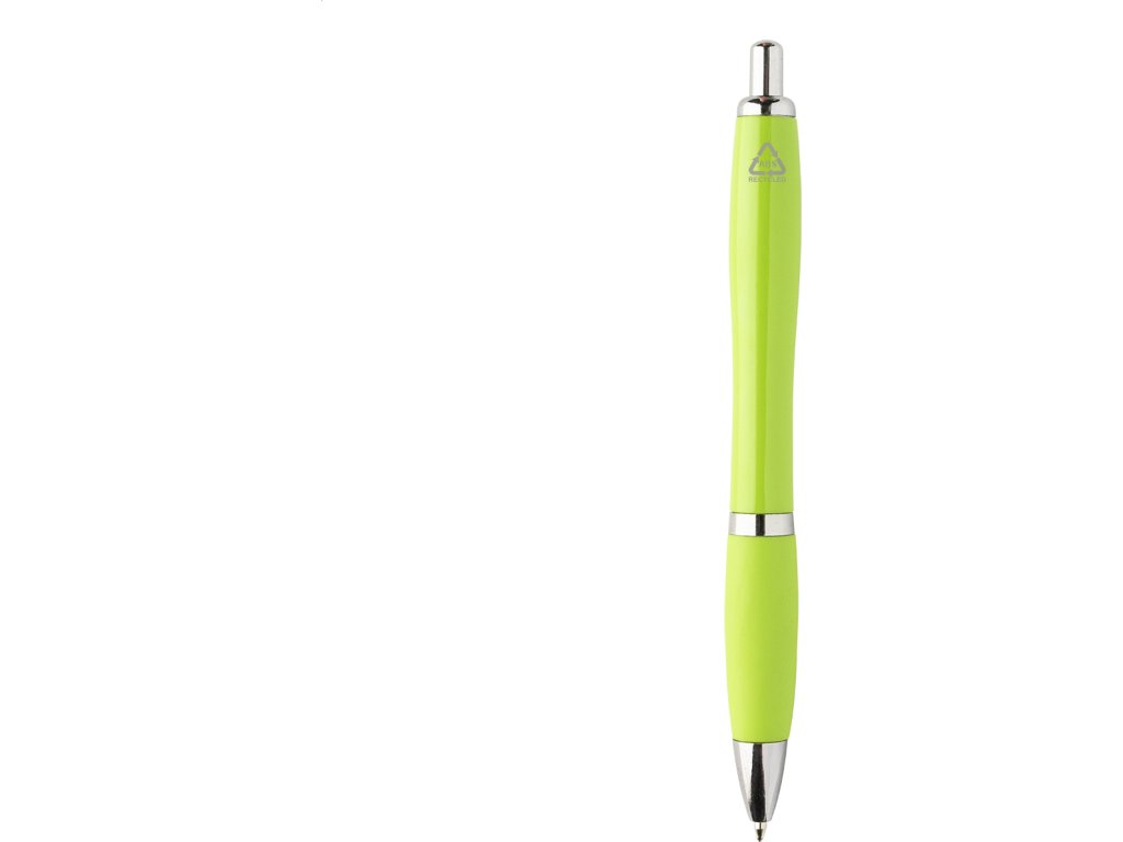 Kuličkové pero z recyklovaného ABS plastu s úchopem v odpovídající barvě a chromovanými částmi. S modrou náplní.