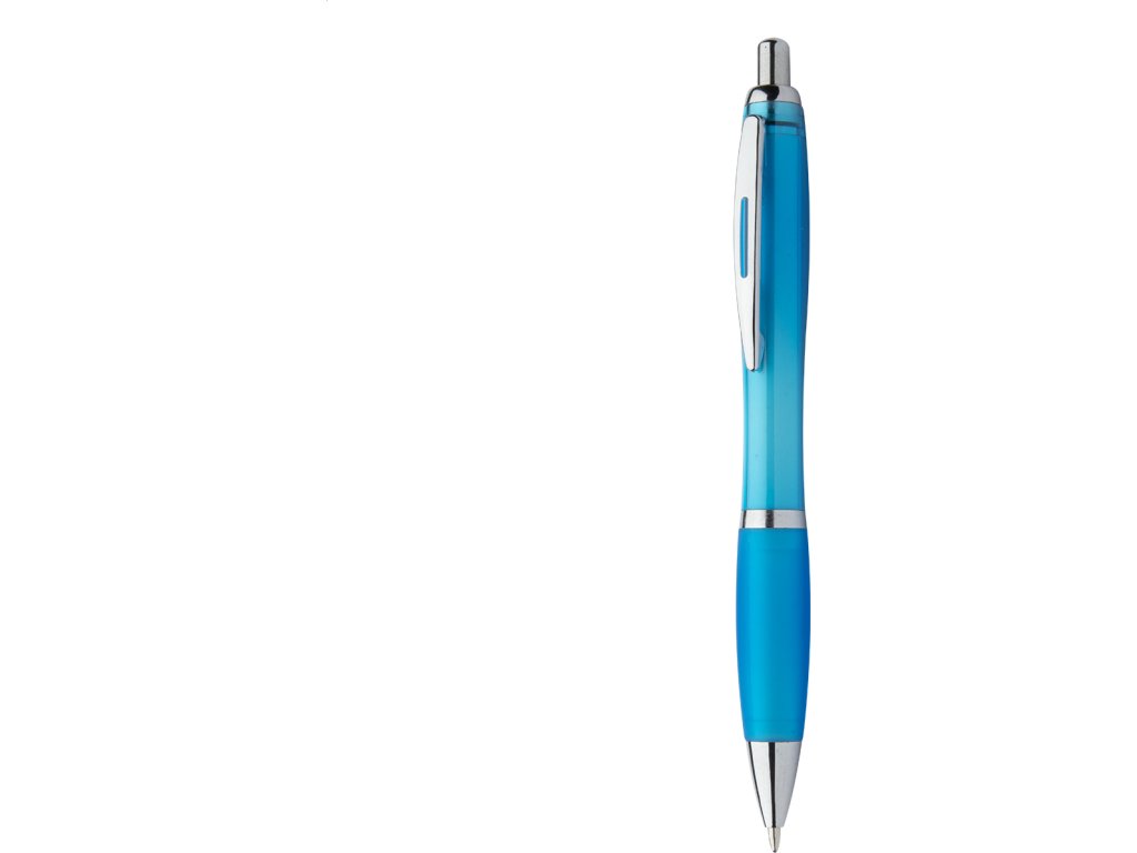 Plastové kuličkové pero s průhledným tělem, úchopem v odpovídající barvě a lesklými chromovanými částmi. S modrou náplní.