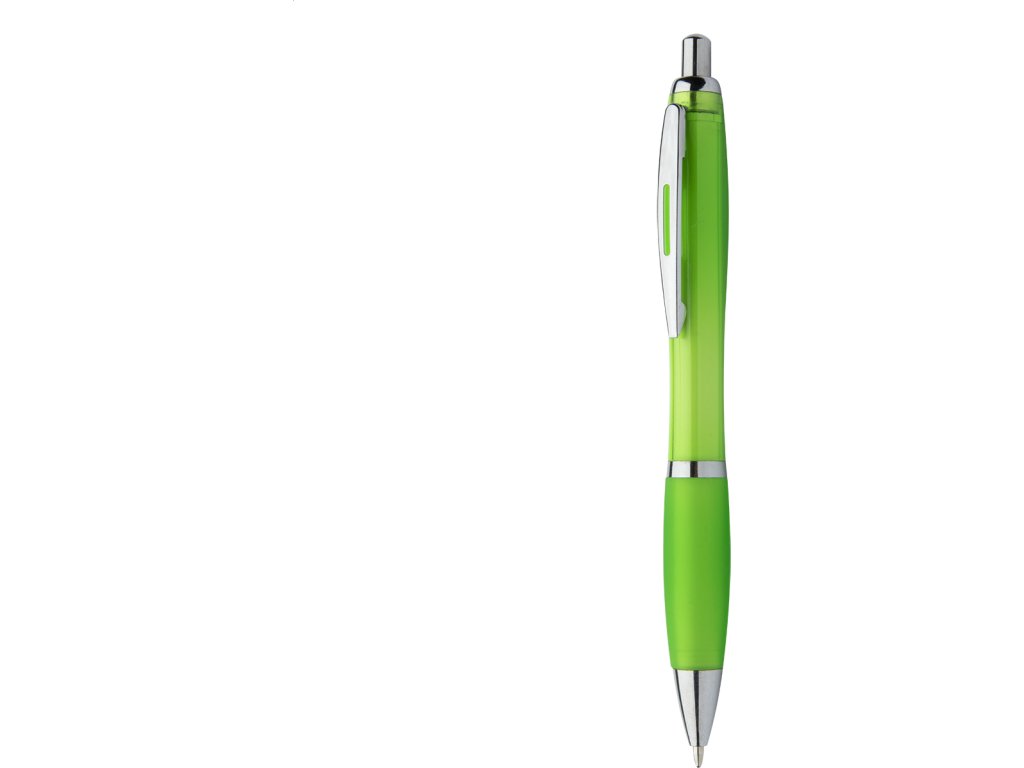 Plastové kuličkové pero s průhledným tělem, úchopem v odpovídající barvě a lesklými chromovanými částmi. S modrou náplní.