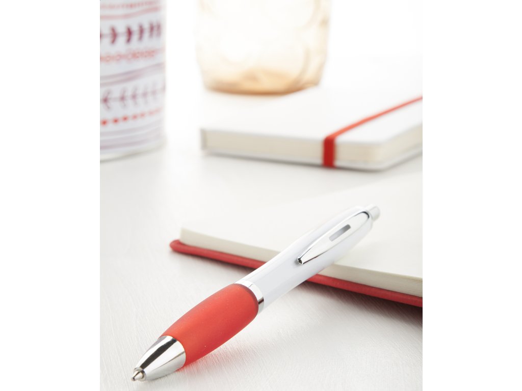Plastové kuličkové pero s bílým tělem, barevným úchopem a lesklými chromovanými částmi. S modrou náplní.