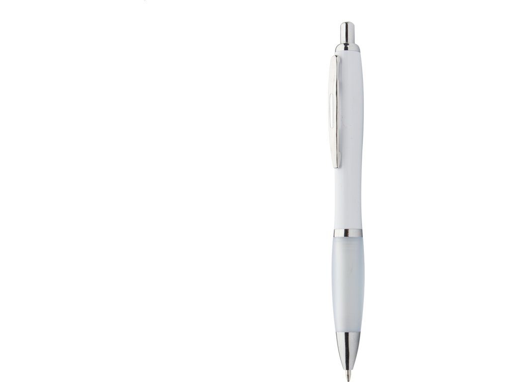 Plastové kuličkové pero s bílým tělem, barevným úchopem a lesklými chromovanými částmi. S modrou náplní.
