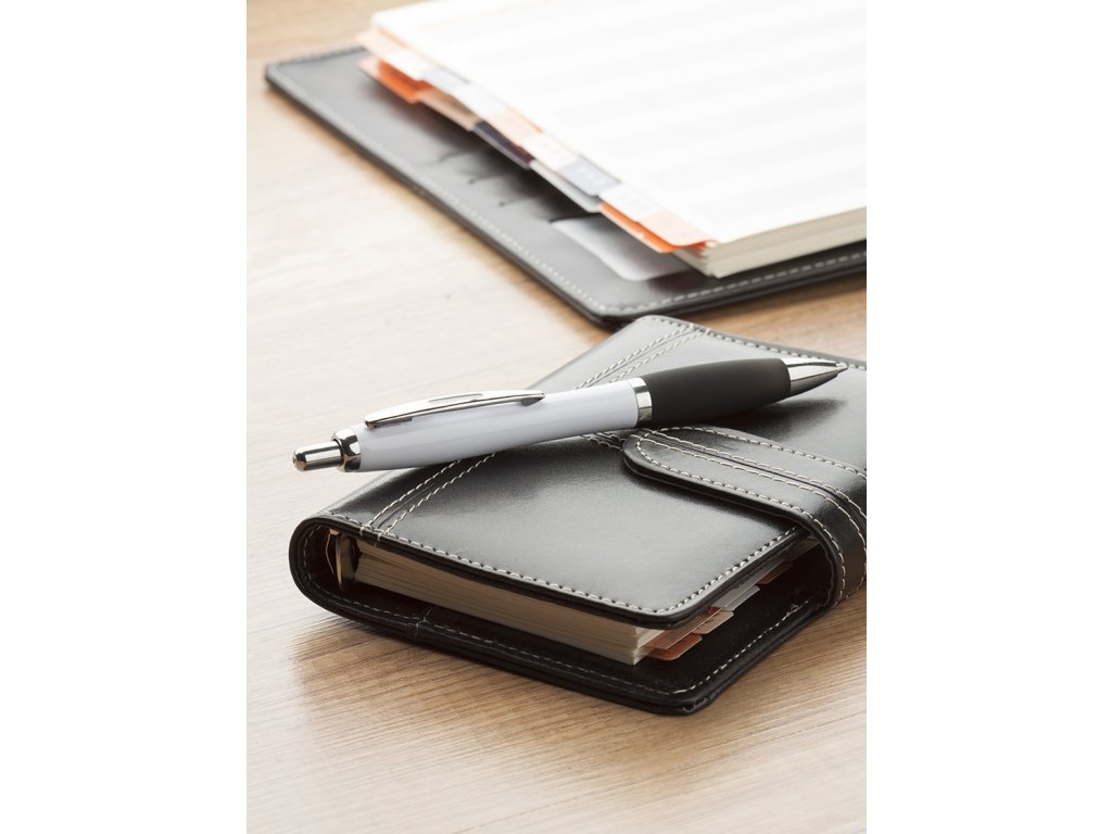 Plastové kuličkové pero s bílým tělem, barevným úchopem a lesklými chromovanými částmi. S modrou náplní.