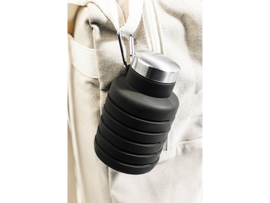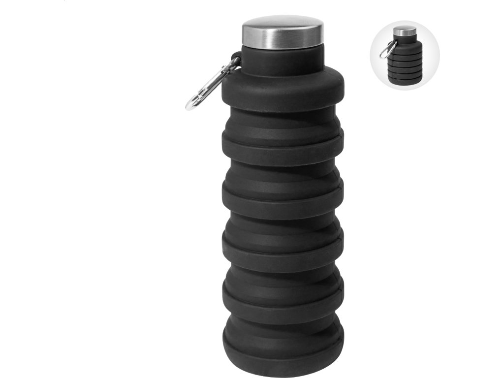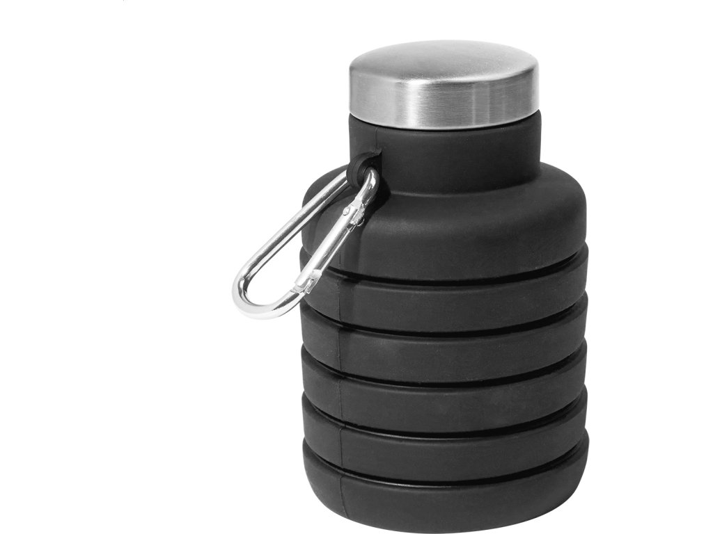 Skládací silikonová láhev s víčkem z nerezové oceli a hliníkovou karabinou. 500 ml