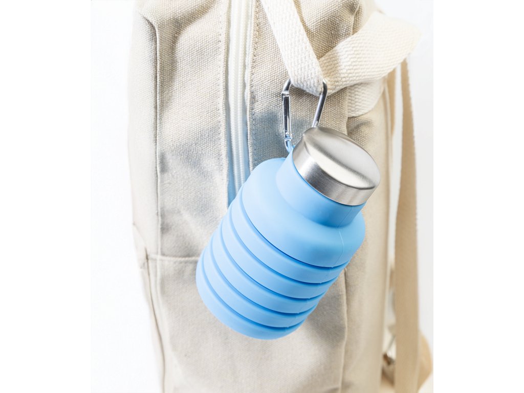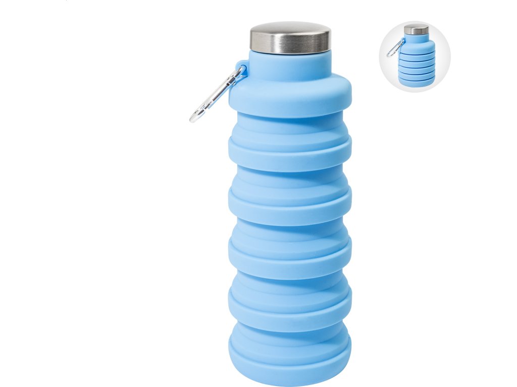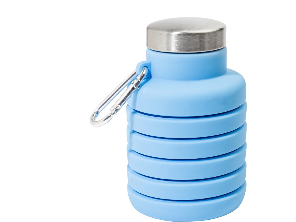 Skládací silikonová láhev s víčkem z nerezové oceli a hliníkovou karabinou. 500 ml
