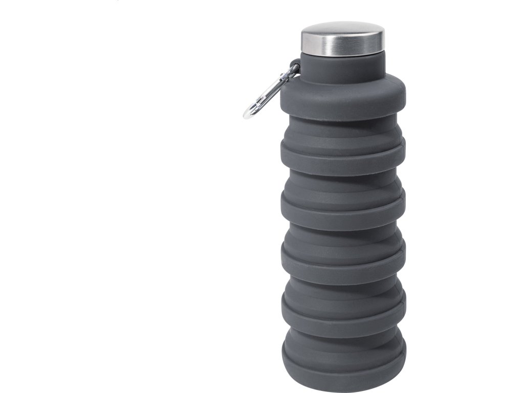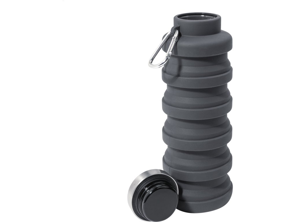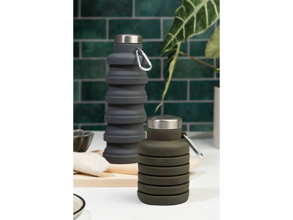 Skládací silikonová láhev s víčkem z nerezové oceli a hliníkovou karabinou. 500 ml