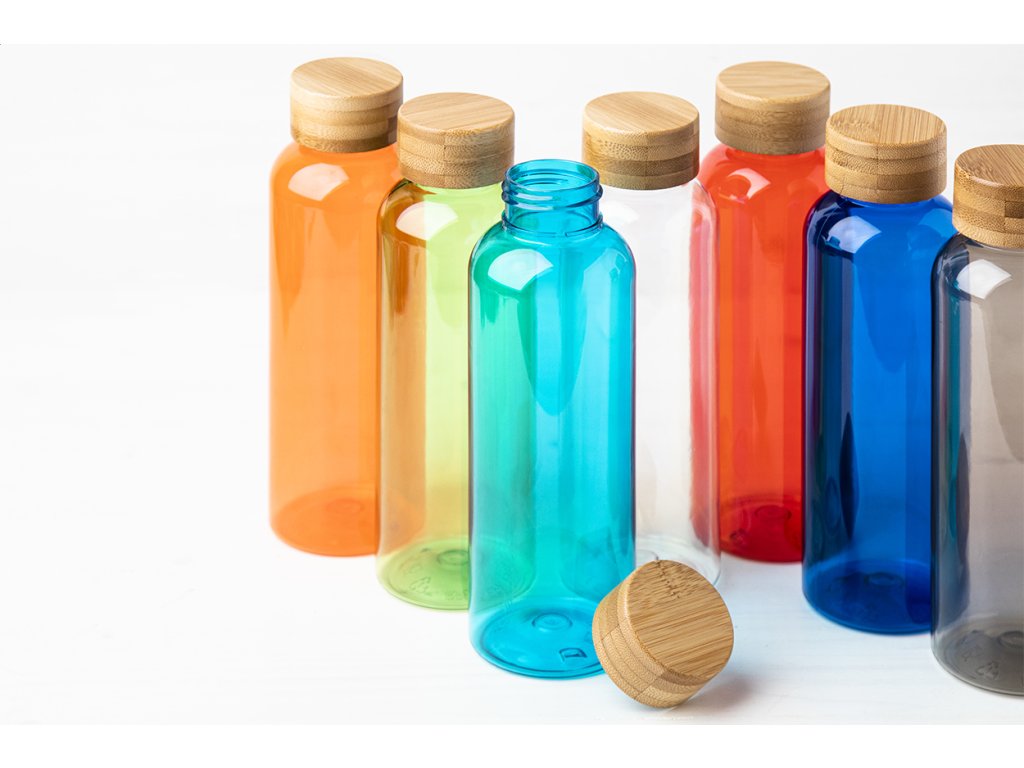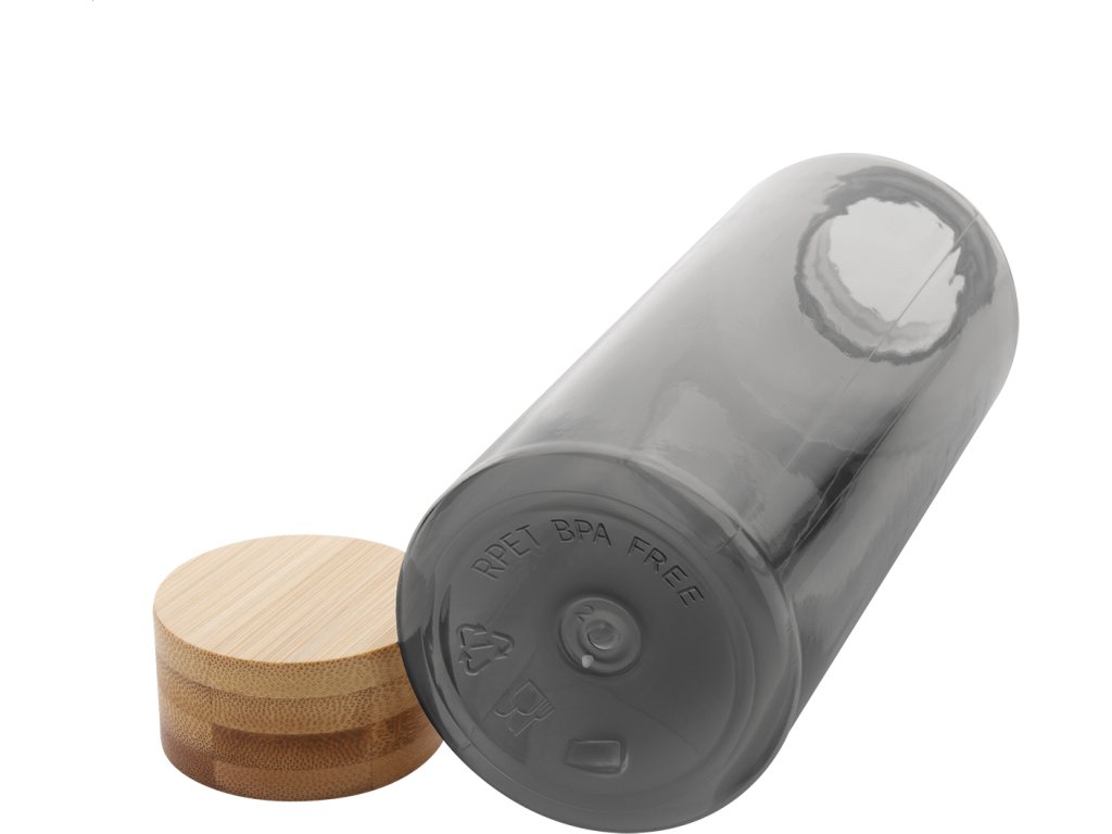 Láhev RPET s bambusovým víčkem, 500 ml. Bez BPA. Nevhodné pro sycené nápoje.