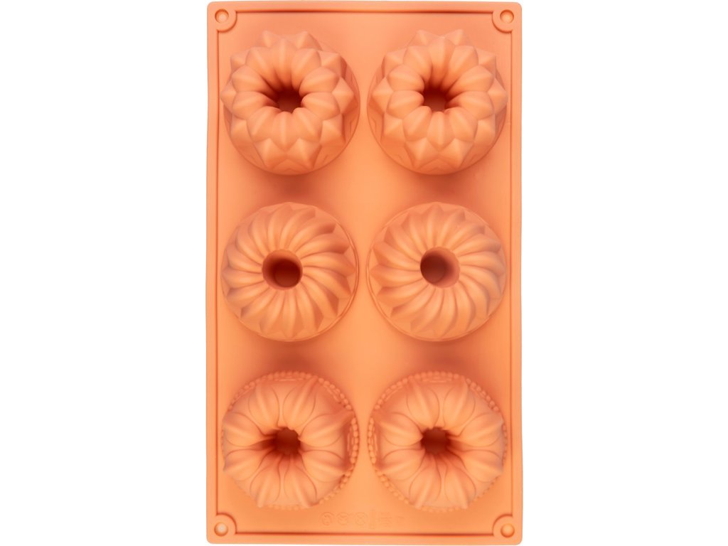 Vyrobená zvysokokvalitného silikónu, ktorý jeflexibilný, nepriľnavý a odolný voči vysokým teplotám, umožňuje jednoduché vyberanie upečených dezertov bez poškodenia ich tvaru. Materiál jebezpečný pre styk s potravinami, vhodný do rúry, mikrovlnnej rúry, mrazničky aj umývačky riadu.