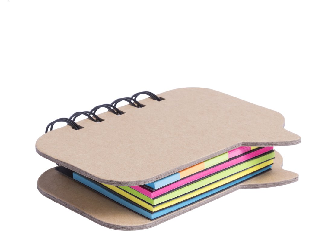 Blok s různě barevnými samolepícími lístky (100 ks 5,1x7,5 cm a 125 ks 1,5x5,1 cm), ve spirálové vazbě s deskami ve tvaru bubliny z recyklovaného papíru.