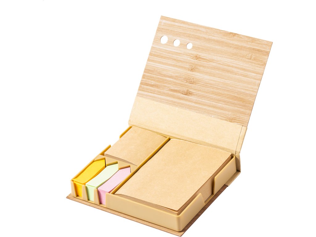 Blok z recyklovaného papíru potažený bambusem se 115 velkými, 115 středními a 420 mini lepicími lístky (ve 3 různých barvách).
