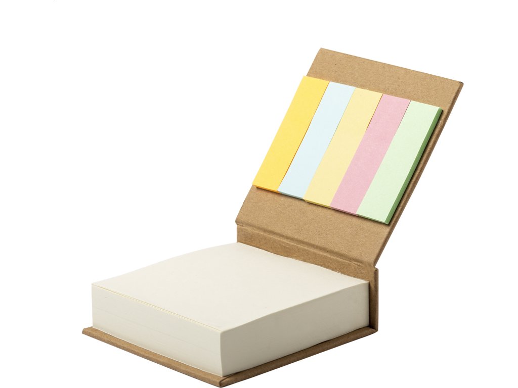 Bloček s deskami z recyklované lepenky s 200 lístky a 125 mini samolepícími lístky v 5 barvách.