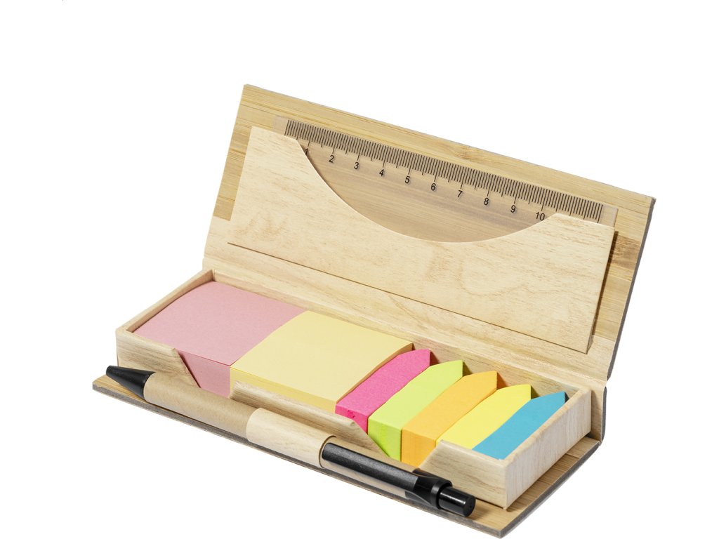 Samolepící poznámkový blok s 220 nalepovacími papírky (ve 2 různých barvách) a 550 značkovači stránek (v 5 různých barvách) v bambusovém pouzdře. Včetně 12 cm pravítka a propisky z recyklovaného kartonu s modrou náplní.