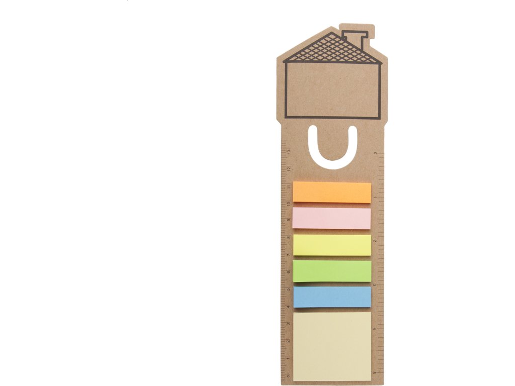 Papírová záložka do knihy a pravítko se samolepícími lístky s domečkem na konci.
