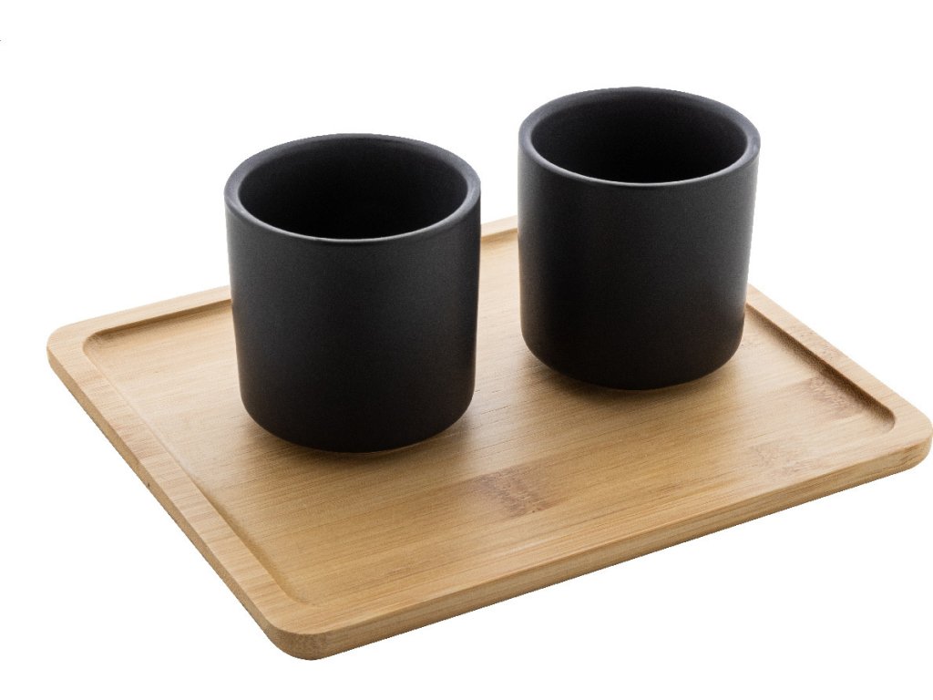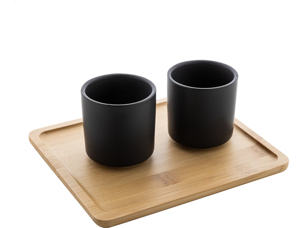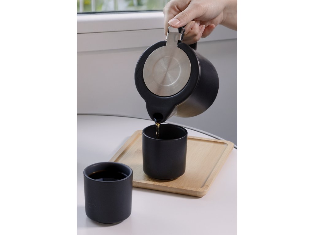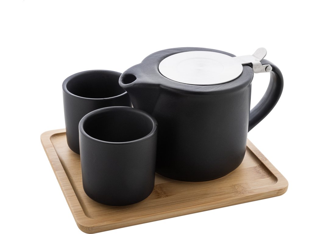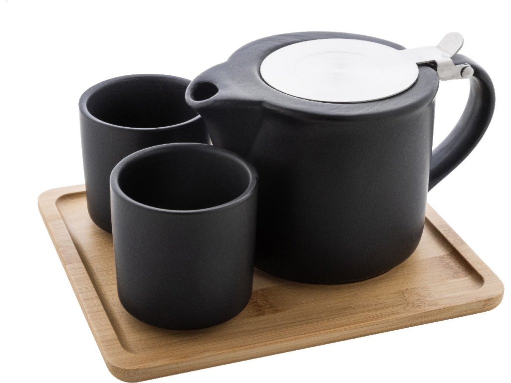 Vysoce kvalitní keramická čajová sada s matným povrchem a bambusovým servírovacím podnosem. Včetně konvice na čaj (500 ml) s víkem z nerezové oceli a sítkem na čaj a dvou šálků (150 ml). V krabičce z kraftového papíru.