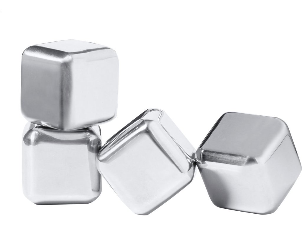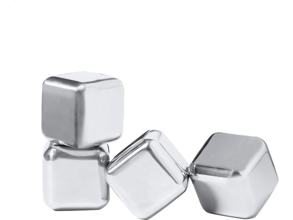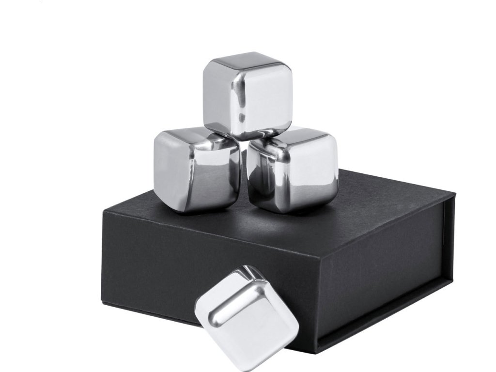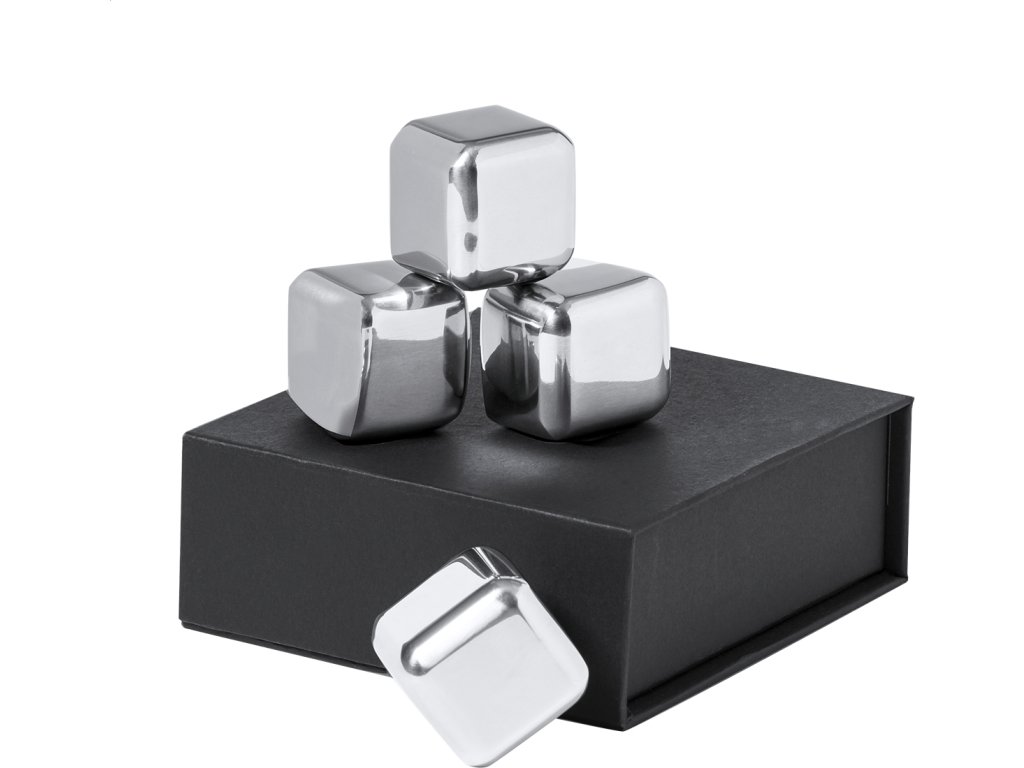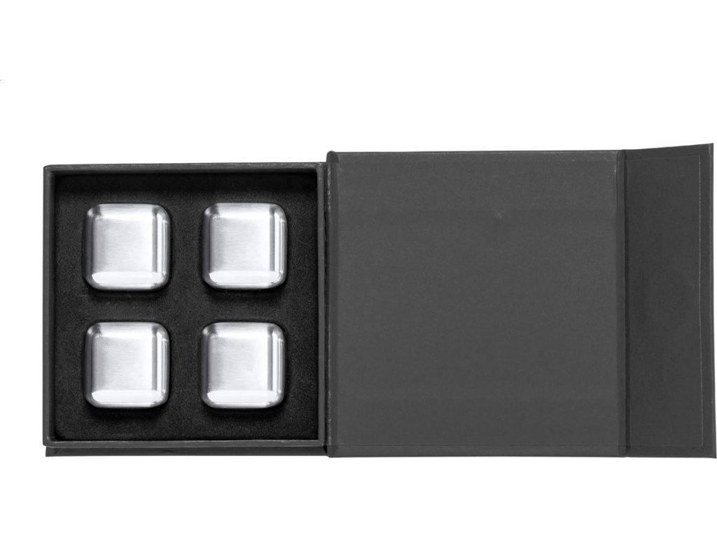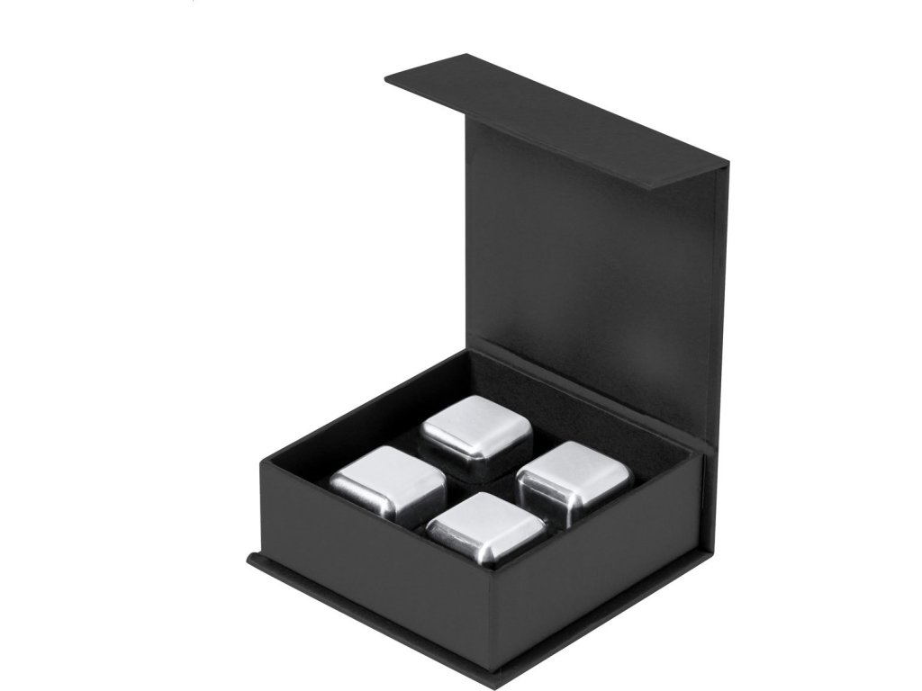 4dílná opakovaně použitelná sada chladících kostek z nerezové oceli v černé dárkové krabičce.
