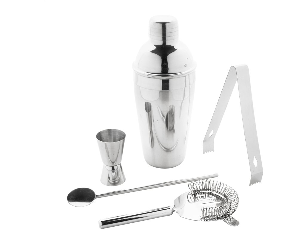 5dílná koktejlová sada z nerezové oceli v kraftové papírové krabičce. Včetně: koktejlového šejkru (550 ml), oodměrky, sítka, barové lžíce a kleští na led.