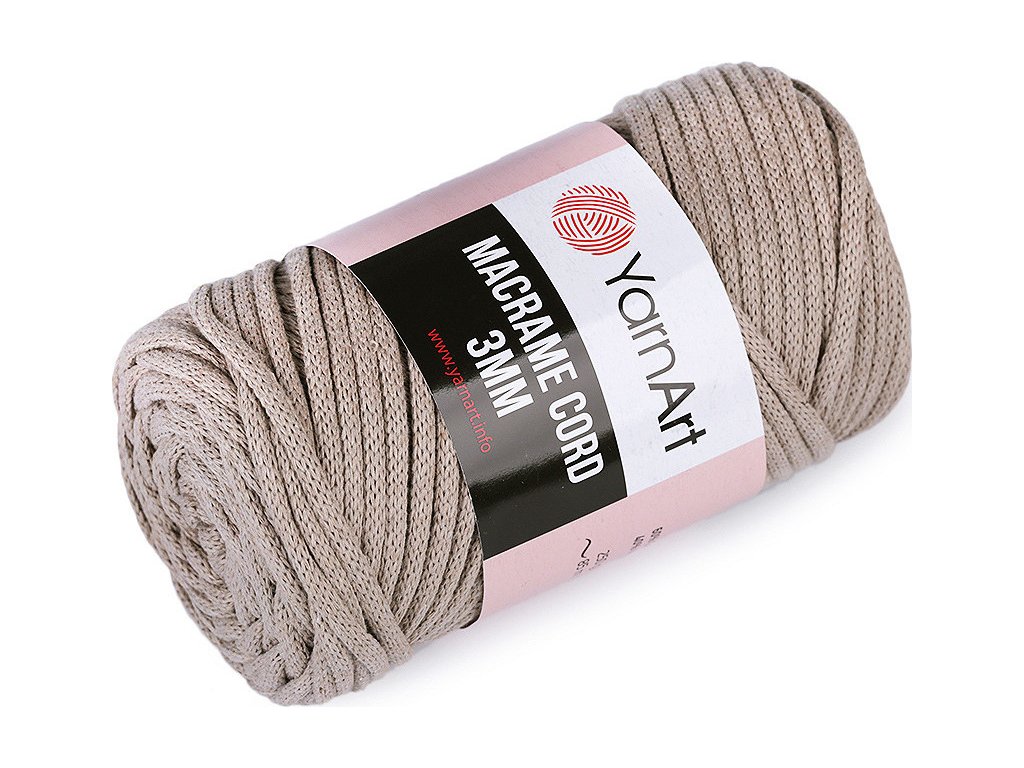 Příze Macrame Cord připomíná provázek. Využijete ji na pletení nebo háčkování pufů, košíků, koberečků i tašek. Velikost jehlic: 7 Velikost háčku: 8 Vzorek na fotografii (29 x 26 cm) byl uháčkován z 1 klubíčka, háčkem č. 8.