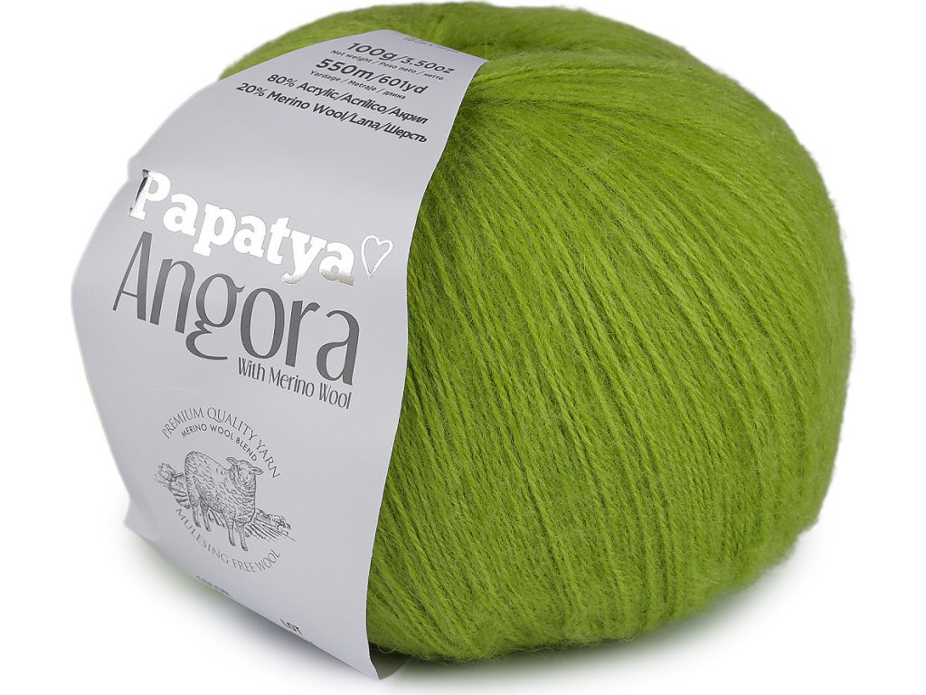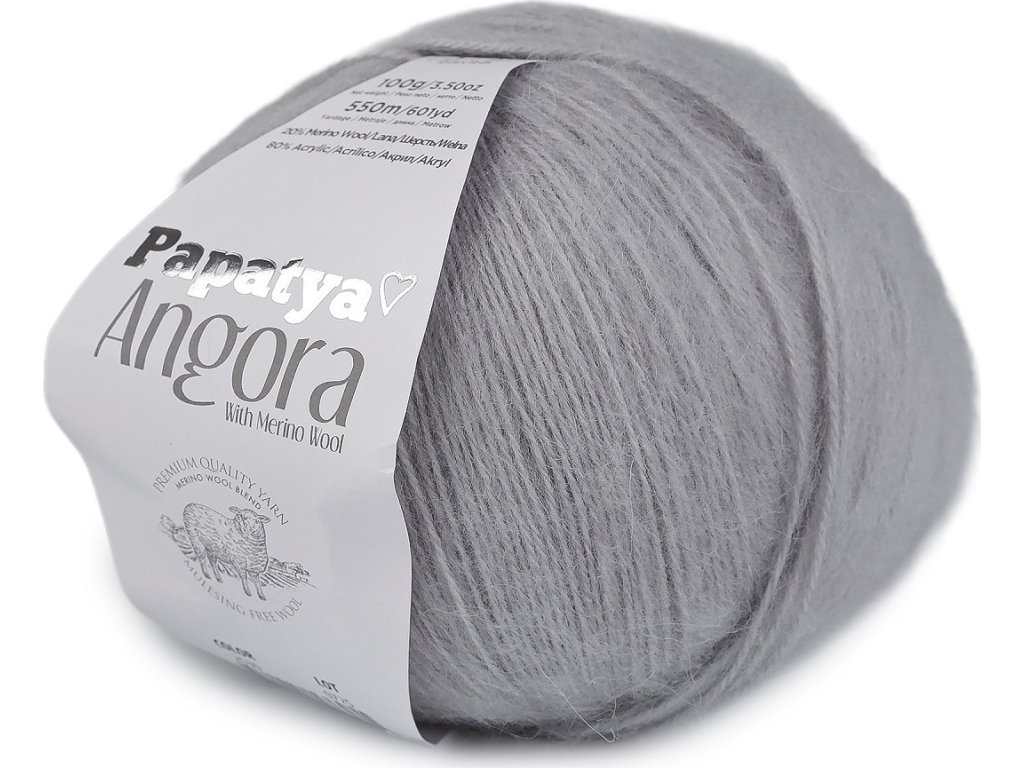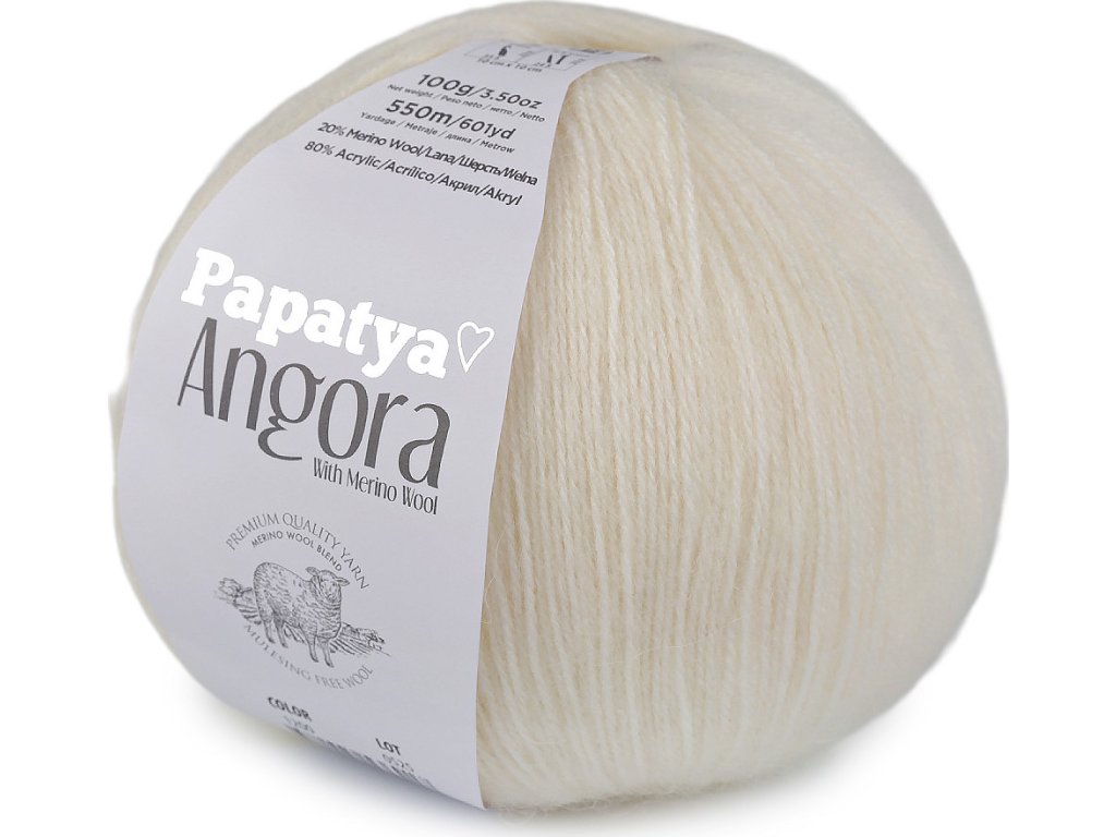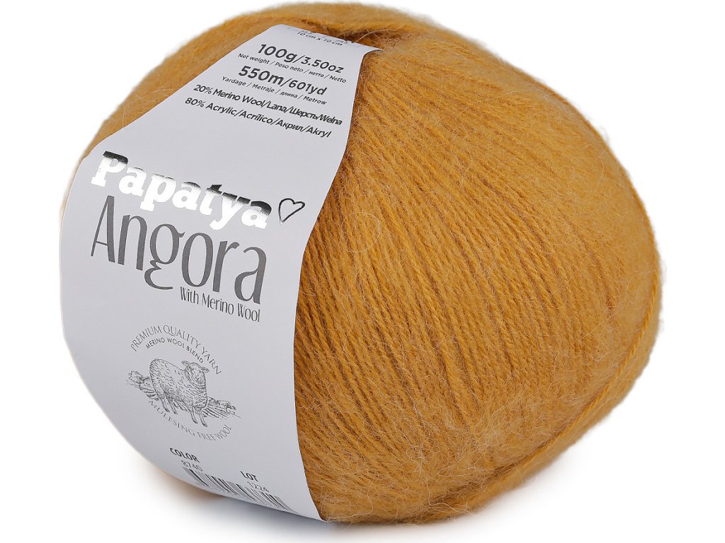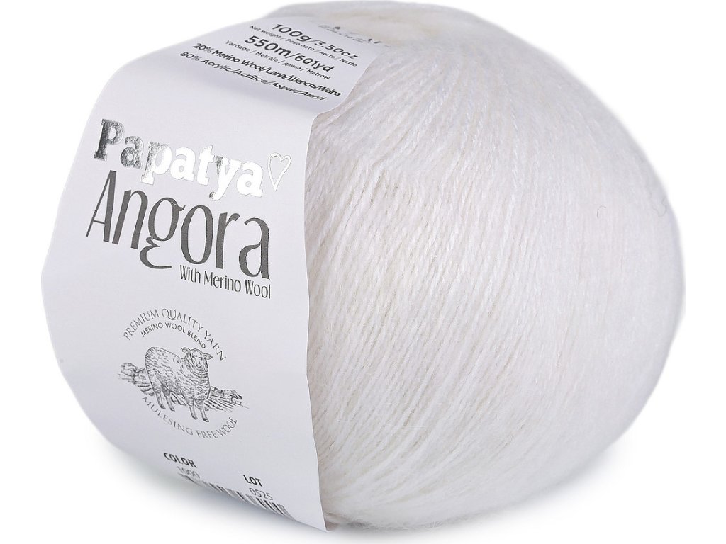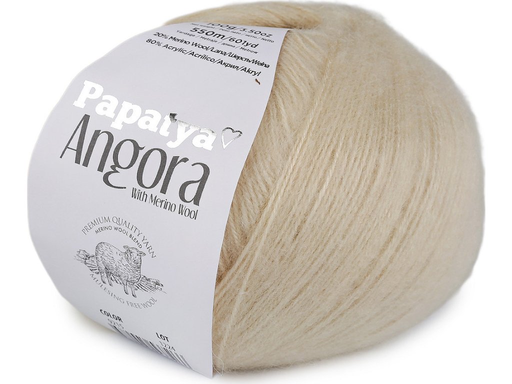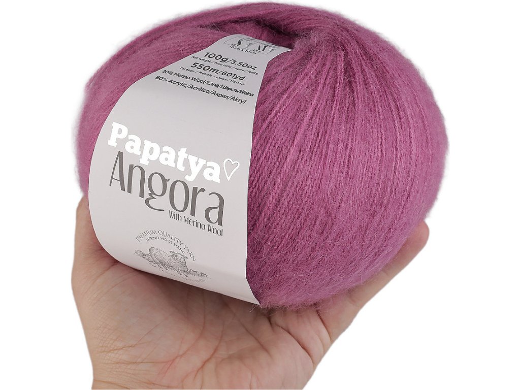 Pletací příze Papatya Angora má jemný nadýchaný vlas a díky podílu merino vlny také zahřeje. Využijete ji na pletení a háčkování vzdušných svetrů, šálů, čepic, vest apod. Velikost jehlic: 3 - 3,5 Velikost háčku: 2