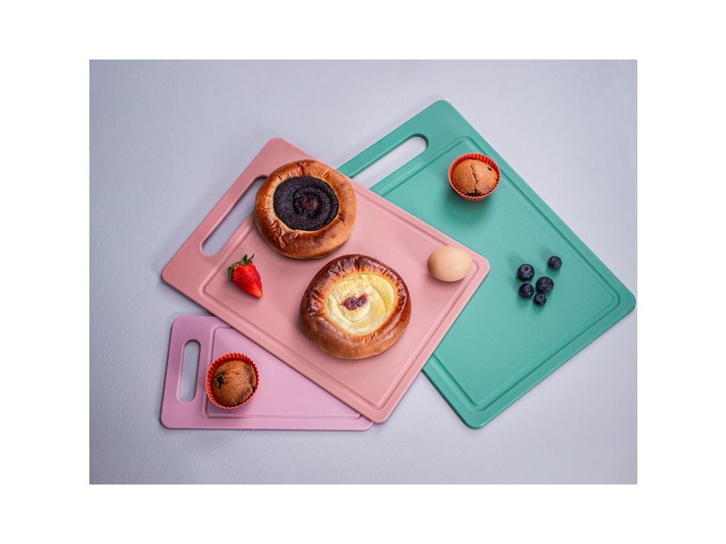 Plastová deska na krájení pokrmů MagicHome v moderní pudrové barvě o rozměrech 34x24,5x0,6 cm.