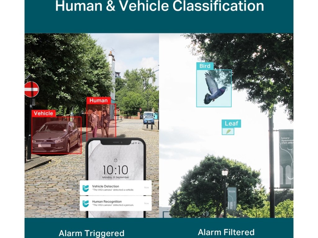 Kamera TP-Link VIGI monitoruje své okolí a díky pokročilým algoritmům dokáže rozlišit lidi a vozidla od ostatních objektů. Pokud chcete dostávat oznámení pouze v některých případech, spustíte pouze detekci lidí či vozidel (nebo detekci vozidel i lidí). Kamera nebude reagovat na padající listí a na poletující ptáky.