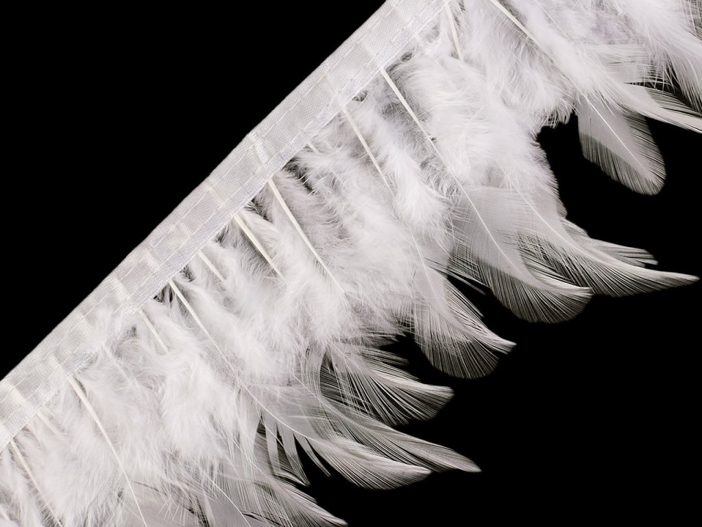 Prýmek z kohoutího peří originálně ozdobí plesové a společenské šaty, taneční i divadelní kostýmy a doplňky. Je vhodný také na výzdobu, např. na různé svatební dekorace nebo do květinových vazeb. Peří je pevně prošité do saténové stuhy.