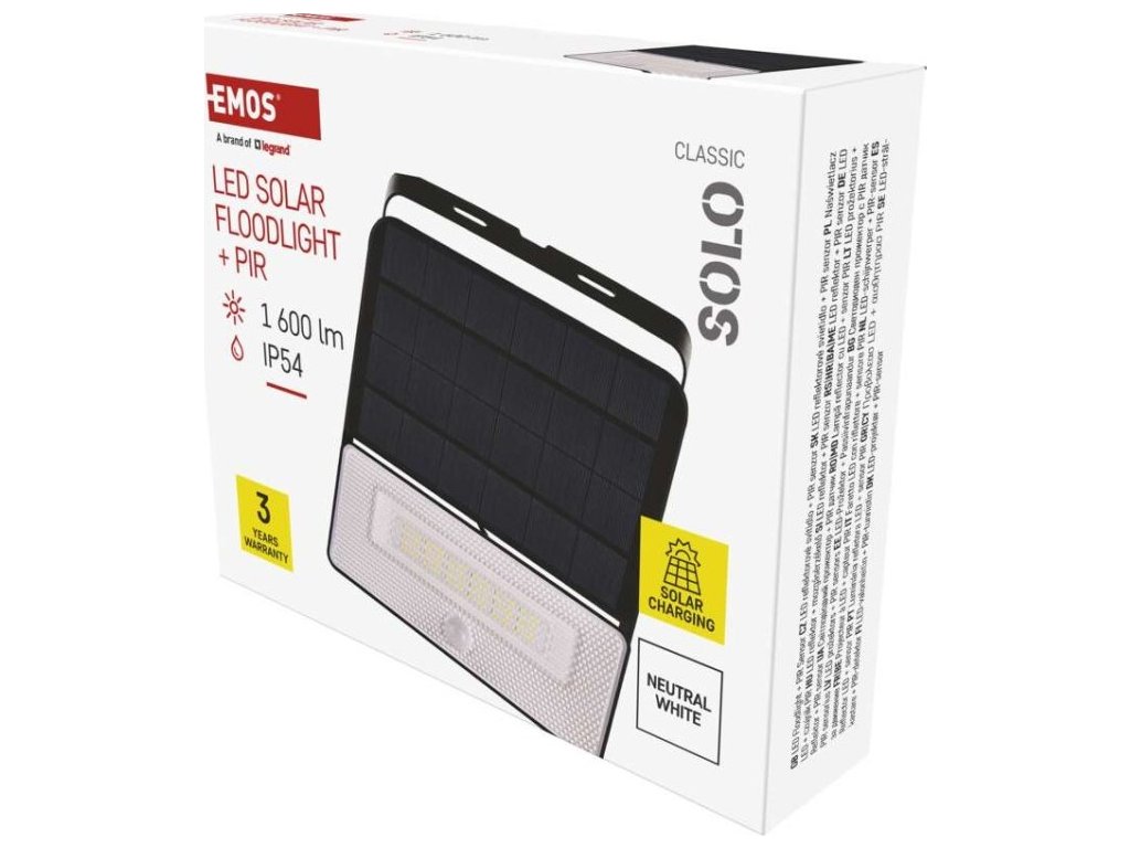 LED solární reflektor EMOS ZG122S SOLO, 1 600 lm, neutrální bílá, PIR senzor s dosahem 6 m, krytí IP54, Li-Ion akumulátor 3 600 mAh, jednoduchá povrchová montáž, ideální pro zahradu či terasu. Rozměry: 196 × 130 × 37 mm.