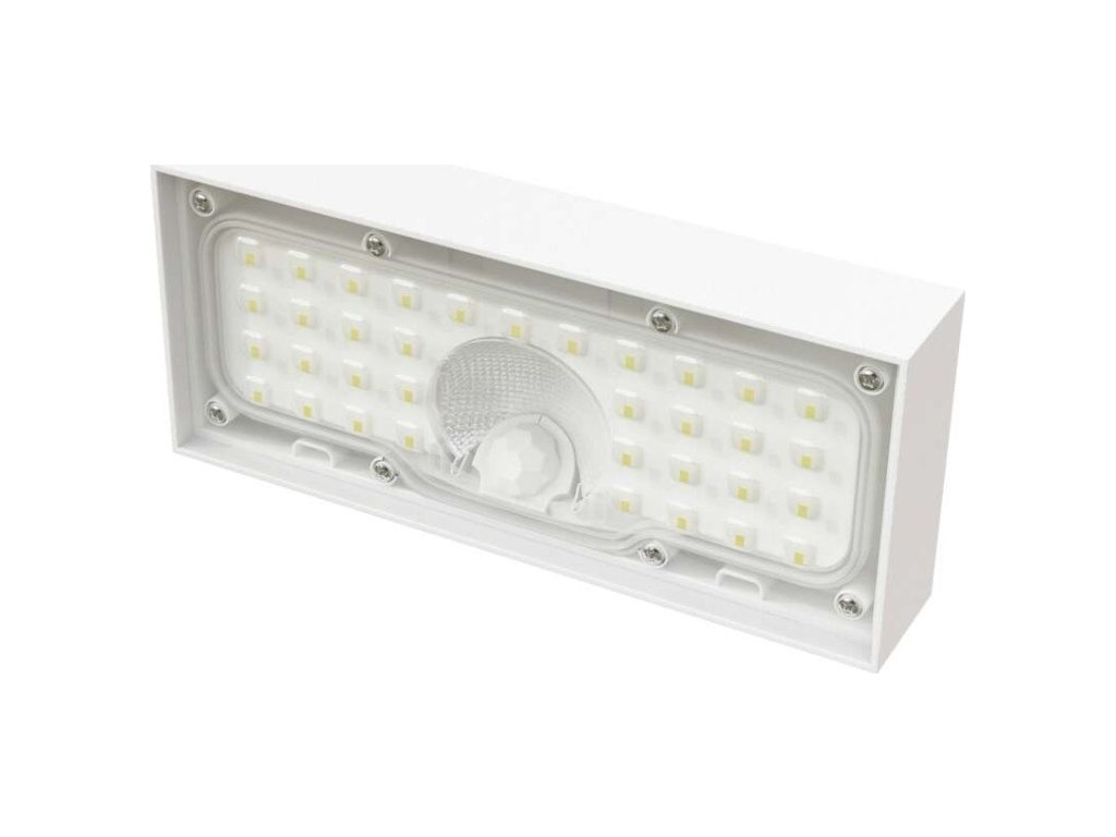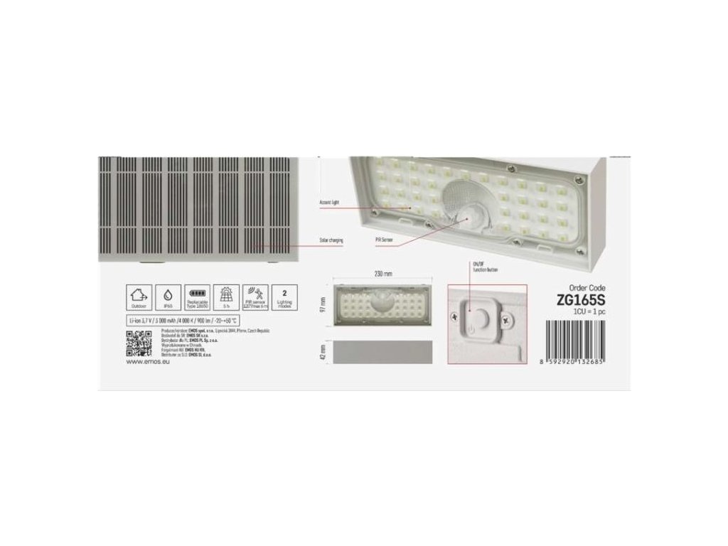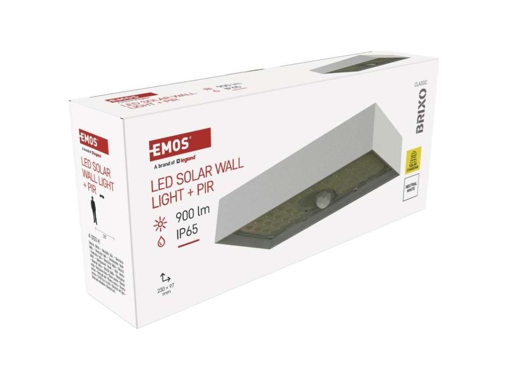 LED solární svítidlo EMOS ZG165S BRIXO s pohybovým čidlem, 900 lm, krytí IP65, neutrální bílá, Li-Ion 3 000 mAh, úhel vyzařování 140° × 70°, bílé provedení. Rozměry 230 × 97 × 43 mm.