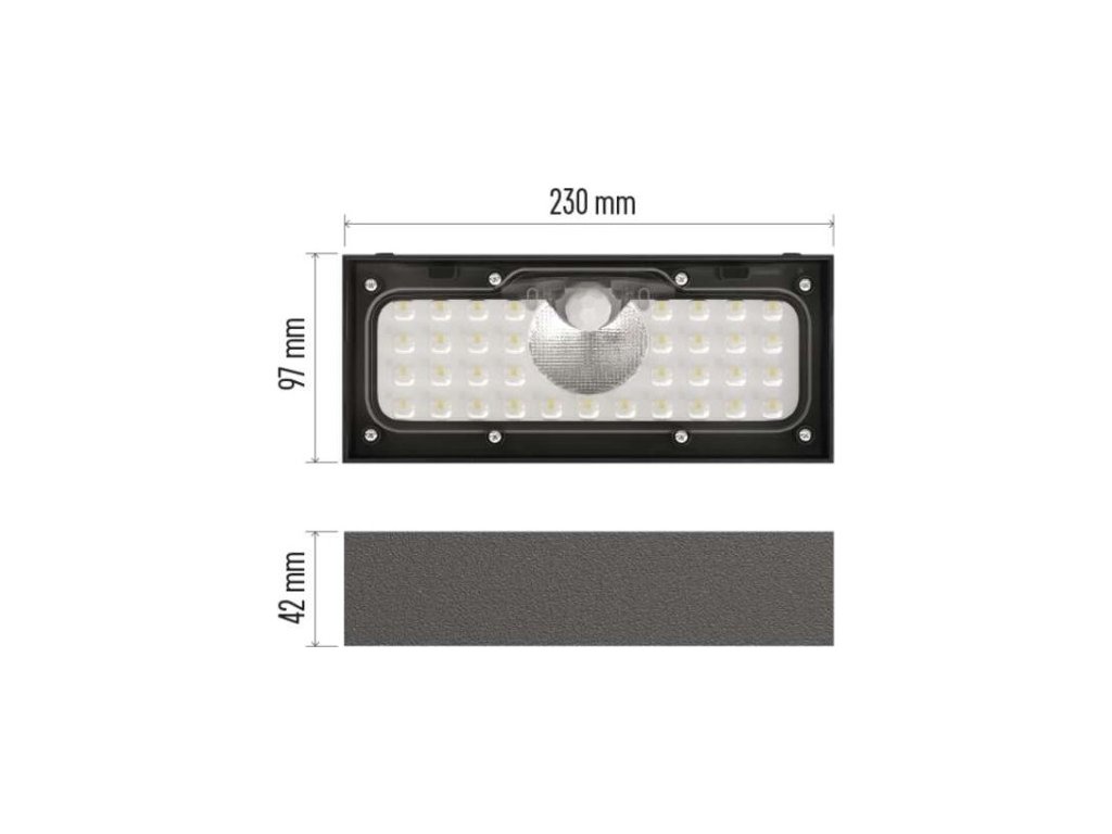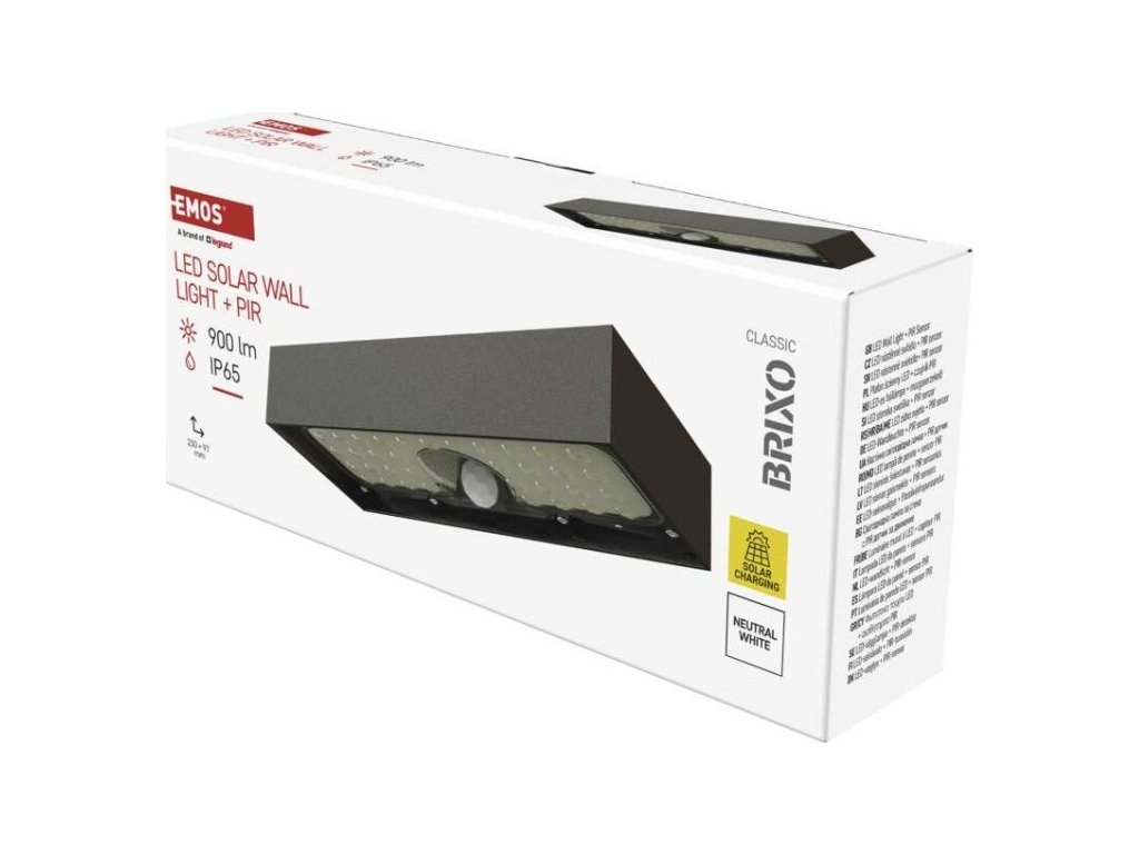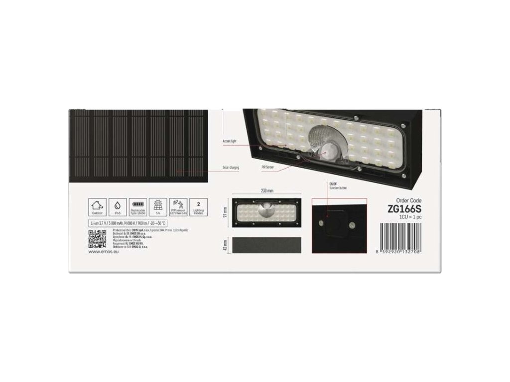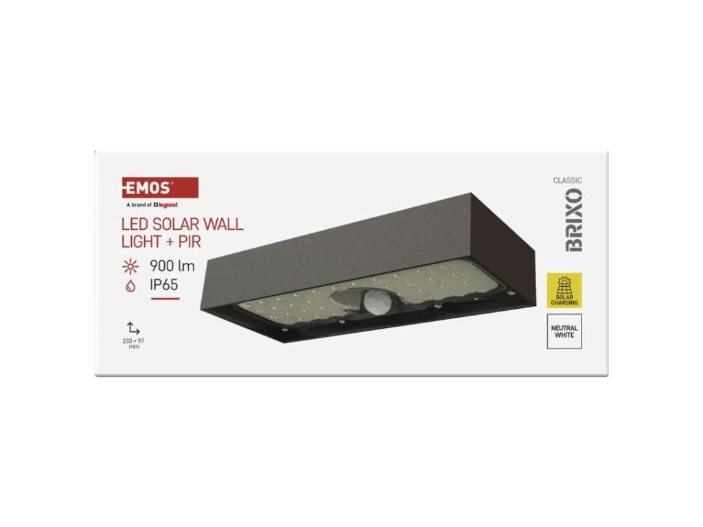 LED solární svítidlo EMOS ZG166S BRIXO s pohybovým čidlem, 900 lm, krytí IP65, neutrální bílá, Li-Ion 3 000 mAh, úhel vyzařování 140° × 70°, černé provedení. Rozměry 230 × 97 × 43 mm.
