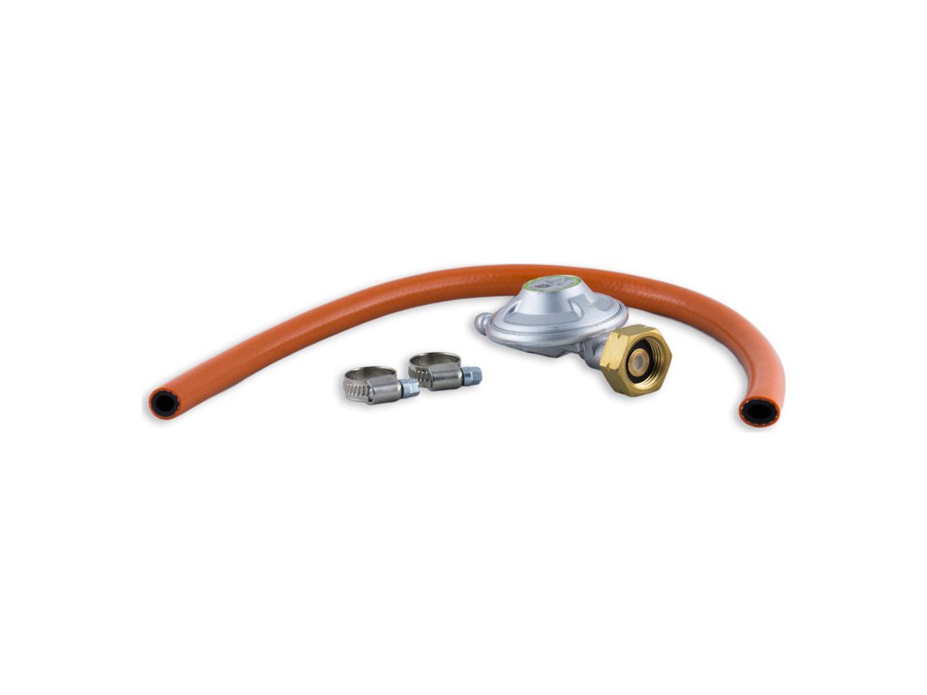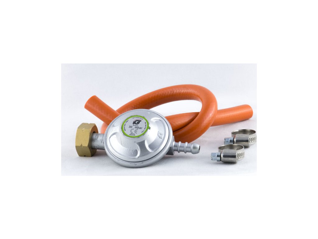 Regulátor 30 mbar a hadice 8mm/50cm se sponami, vhodné k plynovým kamnům