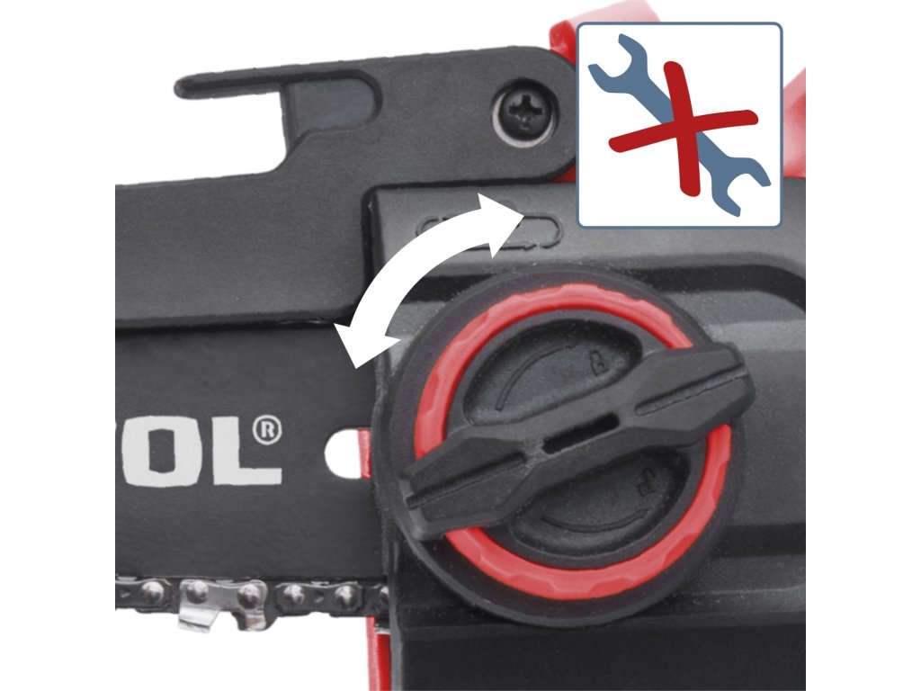 Jednoruční řetězová aku pila je určena k prořezávání stromů a keřů a pro drobné zkracovací řezy dřeva na zahradě, v dílně apod. Aku řetězová pila spojuje výhody elektrických pil – nízký hluk, jednoduchost obsluhy a údržby se svobodou pohybu u benzínových pil. Tato malá aku pila váží jen 1,8kg a je dostatečně robustní na to, aby si snadno poradila s větvemi, ale zároveň dostatečně lehká na to, aby se dala ovládat jednou rukou. Je vybavena kvalitní vodící lištou a pilovým řetězem. Pila má také systém pro snadnou a rychlou výměnu řetězu a mechanismem pro jednoduché vypnutí řetězu. Vysokou bezpečnost zajišťují tři prvky: horní chránič řetězu, chránič rukou, který vás chrání před pořezáním, poškrábáním a škrábanci a spínačem s pojistkou zabraňující náhodnému spuštění. Pogumovaná rukojeť brání vysmeknutí, tlumí vibrace a zpříjemňuje držení při práci. Akumulátor je vybaven ukazatelem nabití, což umožňuje uživateli si rozvrhnout délku práce a dát si včas nabít další akumulátor. Pro běžnou práci dostačují jeden nebo dva 2Ah akumulátory, které můžete rychle nabít v rychlonabíječce, pro náročnější nebo delší práci doporučujeme větší akumulátory s kapacitou 4–8Ah. Akumulátor lze použít ve všech typech nářadí řady EXTOL SHARE20V. Díky použité Li-ion technologii je ho možné kdykoliv dobíjet, aniž by se tím snižovala jeho kapacita. Li-ion akumulátor ztrácí energii vlivem samovybíjení velmi pomalu a vydrží dlouho nabitý a připravený k použití.