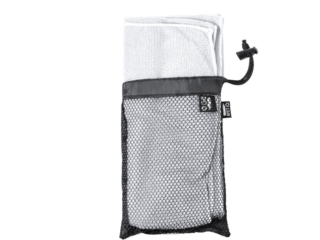 Sportovní ručník z mikrovlákna v přenosném pouzdře RPET s výrazným štítkem RPET. Polyester RPET, 160 g/m².