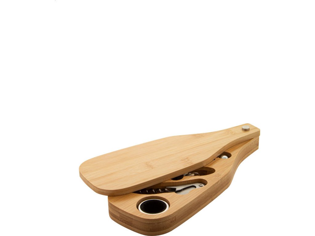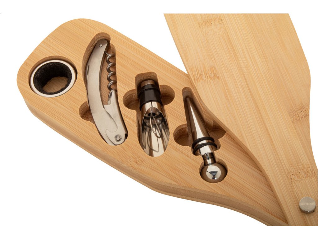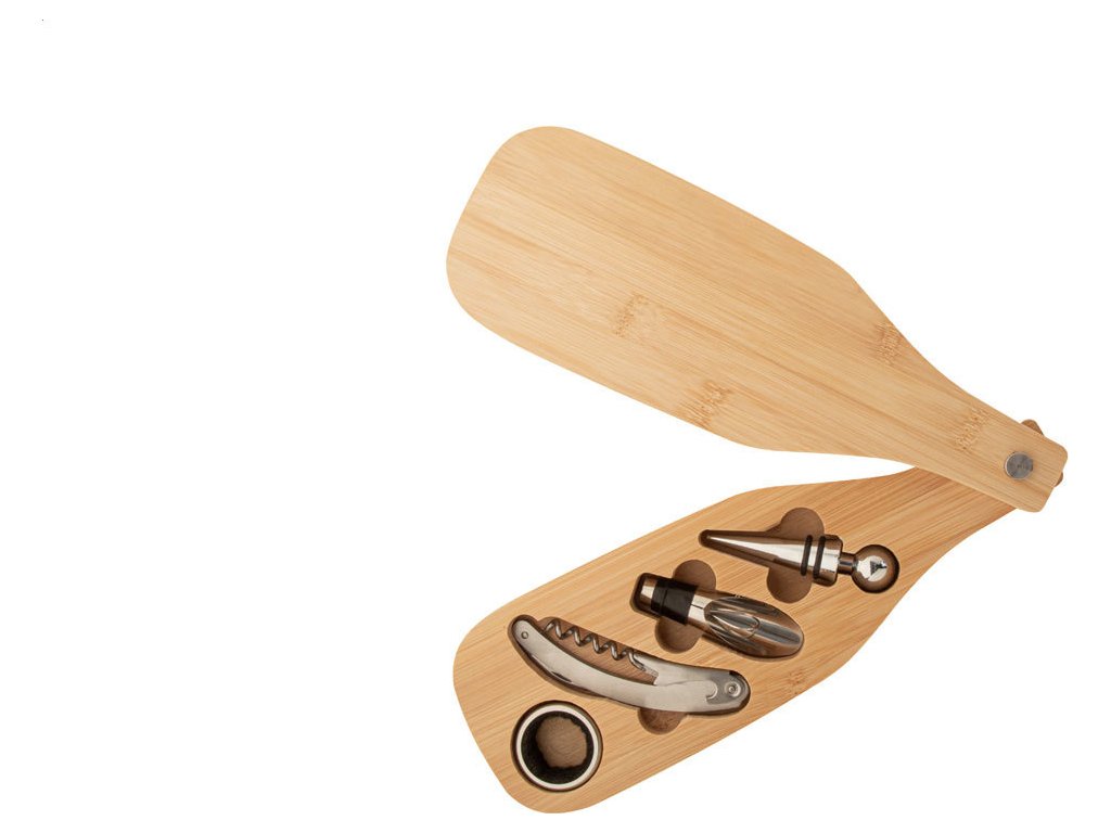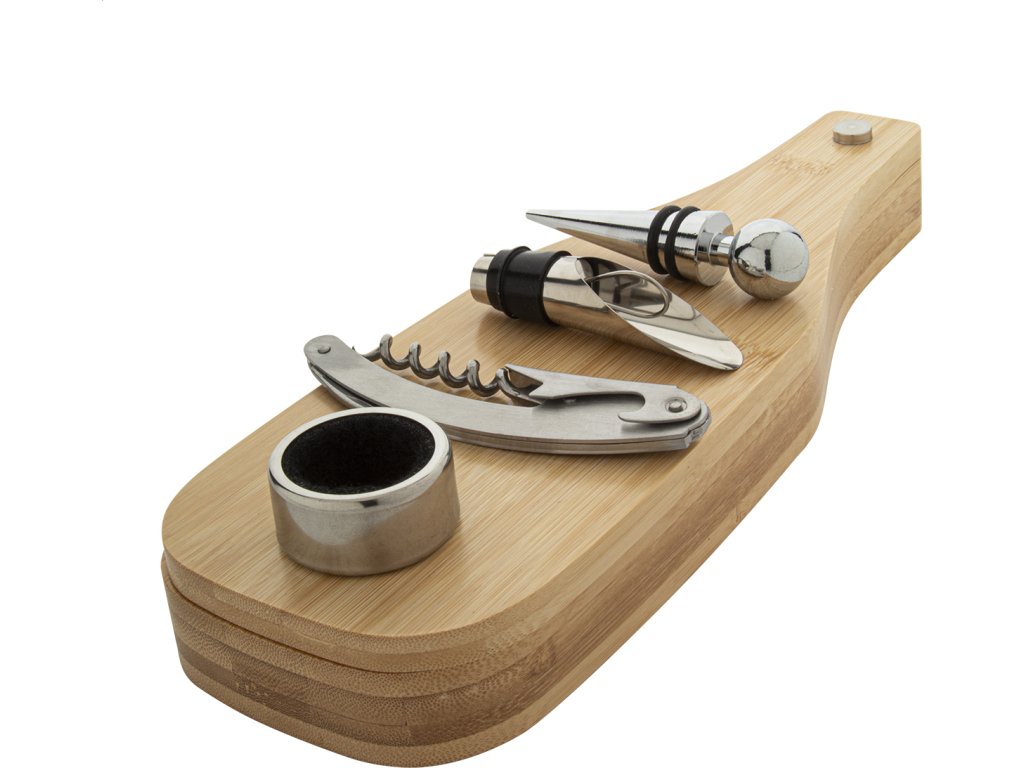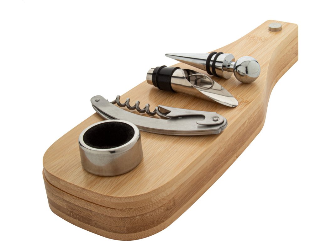 4 ks na víno z nerezové oceli v bambusové krabičce ve tvaru láhve. Včetně vývrtky, zátky, kroužku a nálevky.