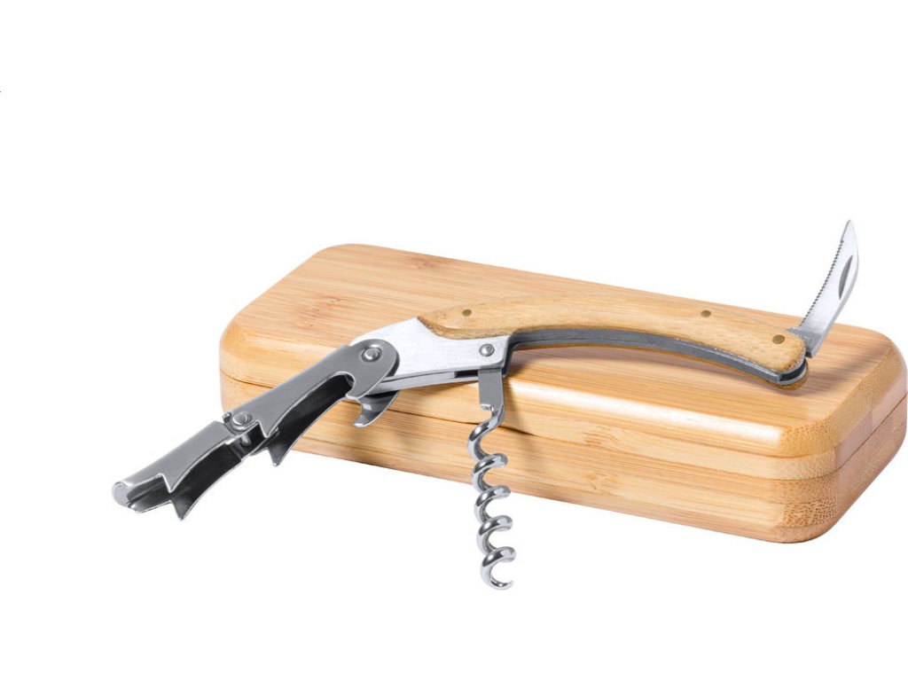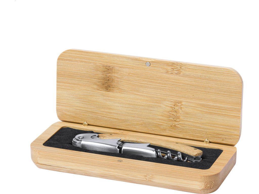 Nerezová vývrtka s otvírákem na láhve a bambusovou rukojetí, v bambusové krabičce.
