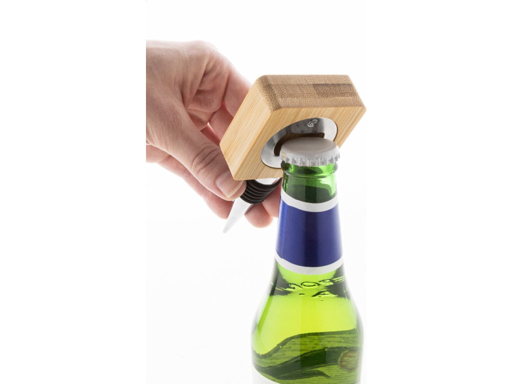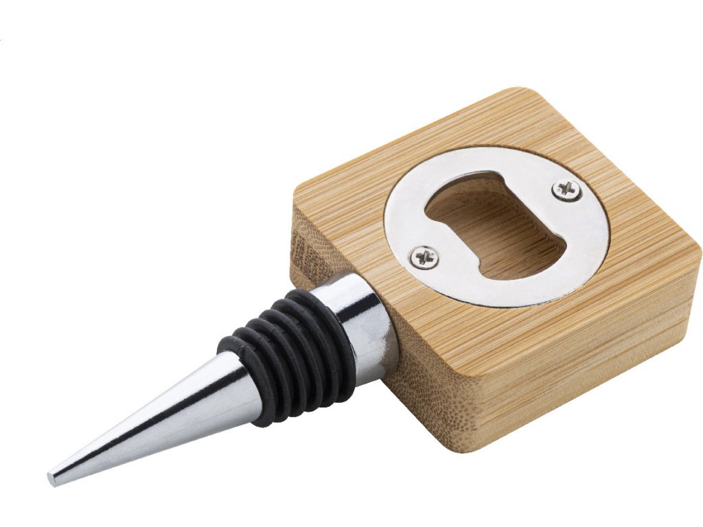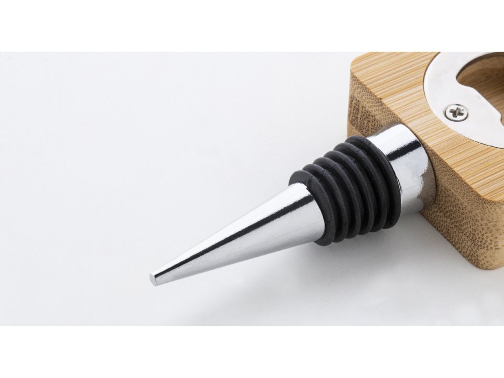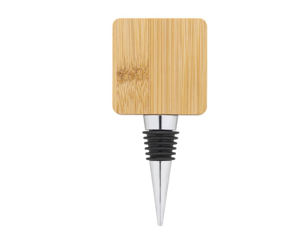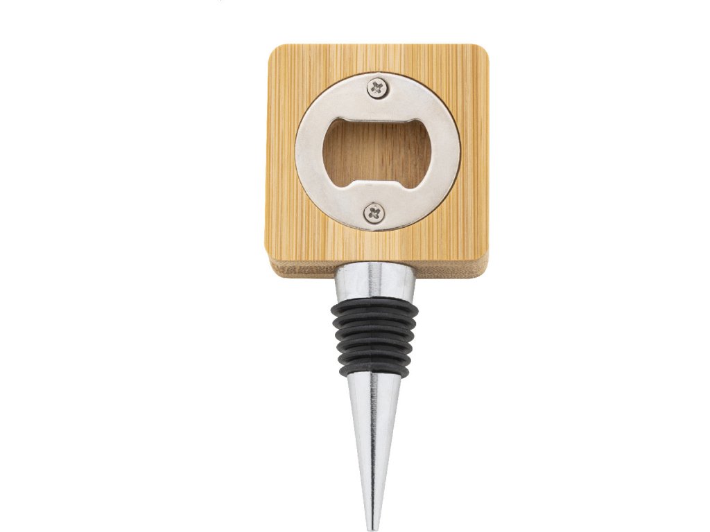 Kovová zátka na víno s čtvercovým bambusovým otvírákem na lahve.