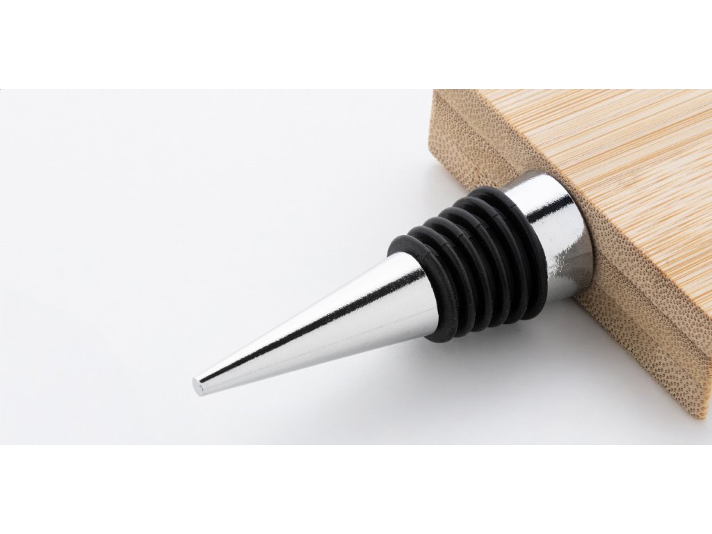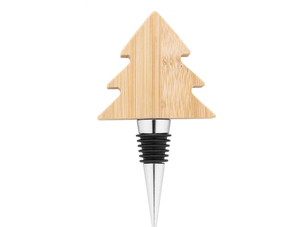Kovová zátka na víno s bambusovou ozdobou ve tvaru vánočního stromečku.