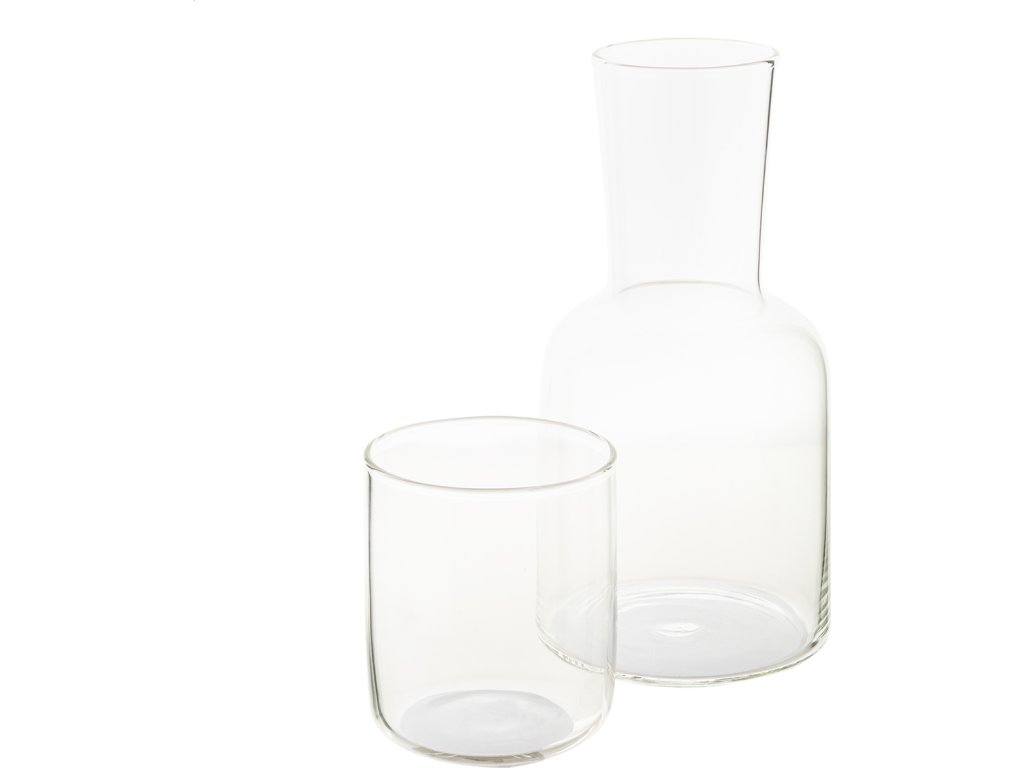 Sada karafy na vodu z borosilikátového skla (800 ml) a sklenice na pití (300 ml). V kraftové papírové krabici. Vhodné pro studené i teplé nápoje, lze použít i jako karafy.