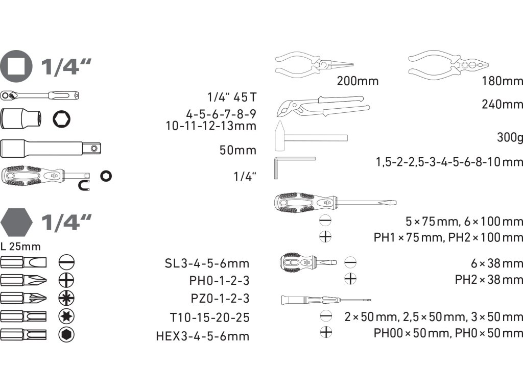 • hroty: 1/4"(L25mm): (-)3-4-5-6, PH0-1-2-3, PZ0-1-2-3, H3-4-5-6mm, T10-15-20-25 (CrV)