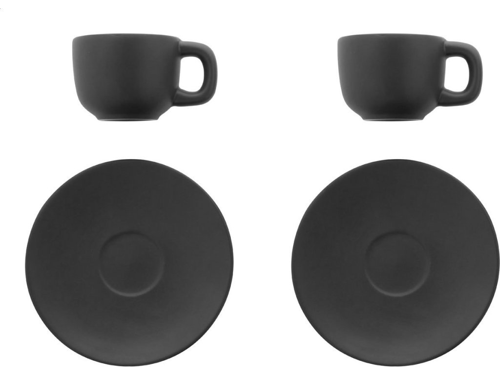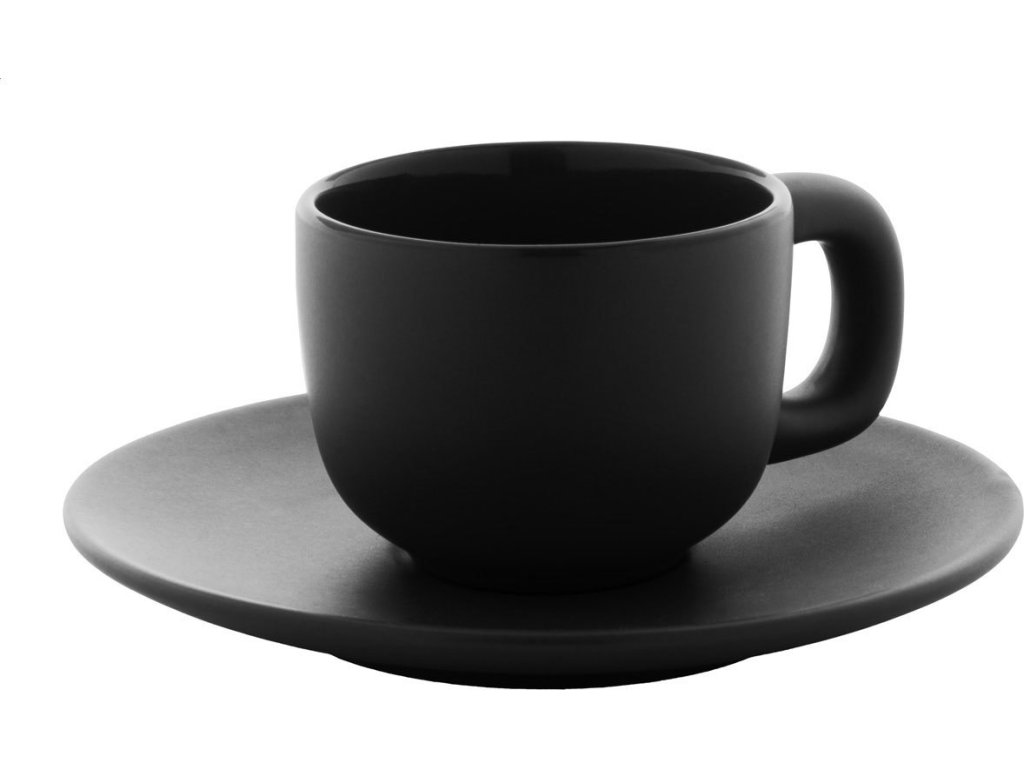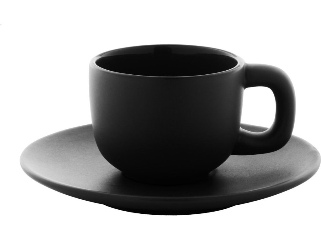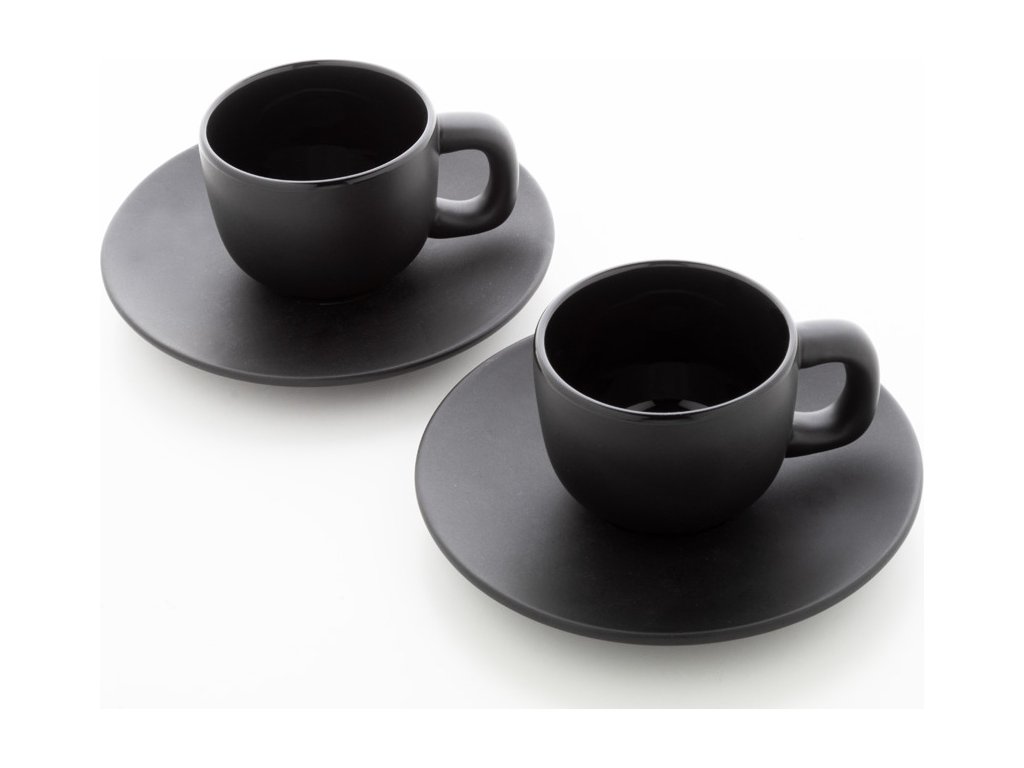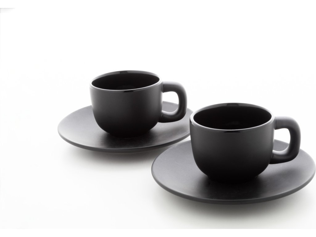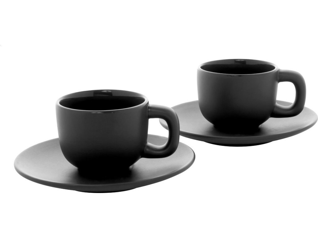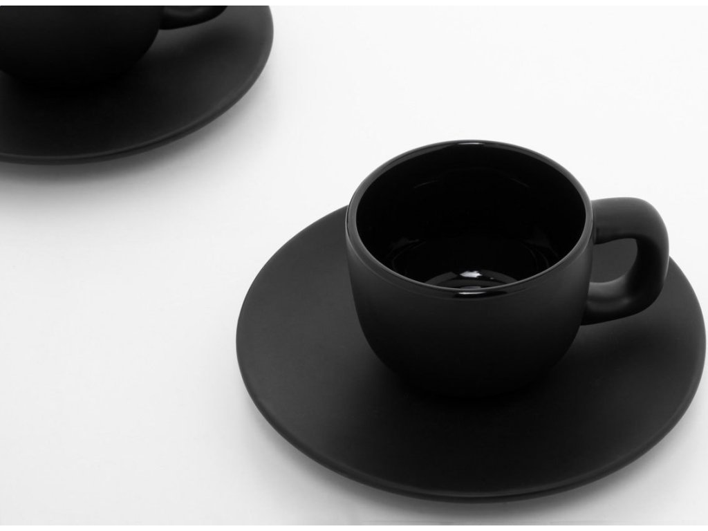 Vysoce kvalitní sada keramických šálků na espresso se 2 šálky a podšálky. S matnou vnější a lesklou vnitřní povrchovou úpravou. 85 ml. V kraftové papírové krabici.