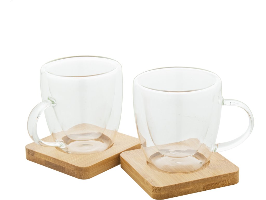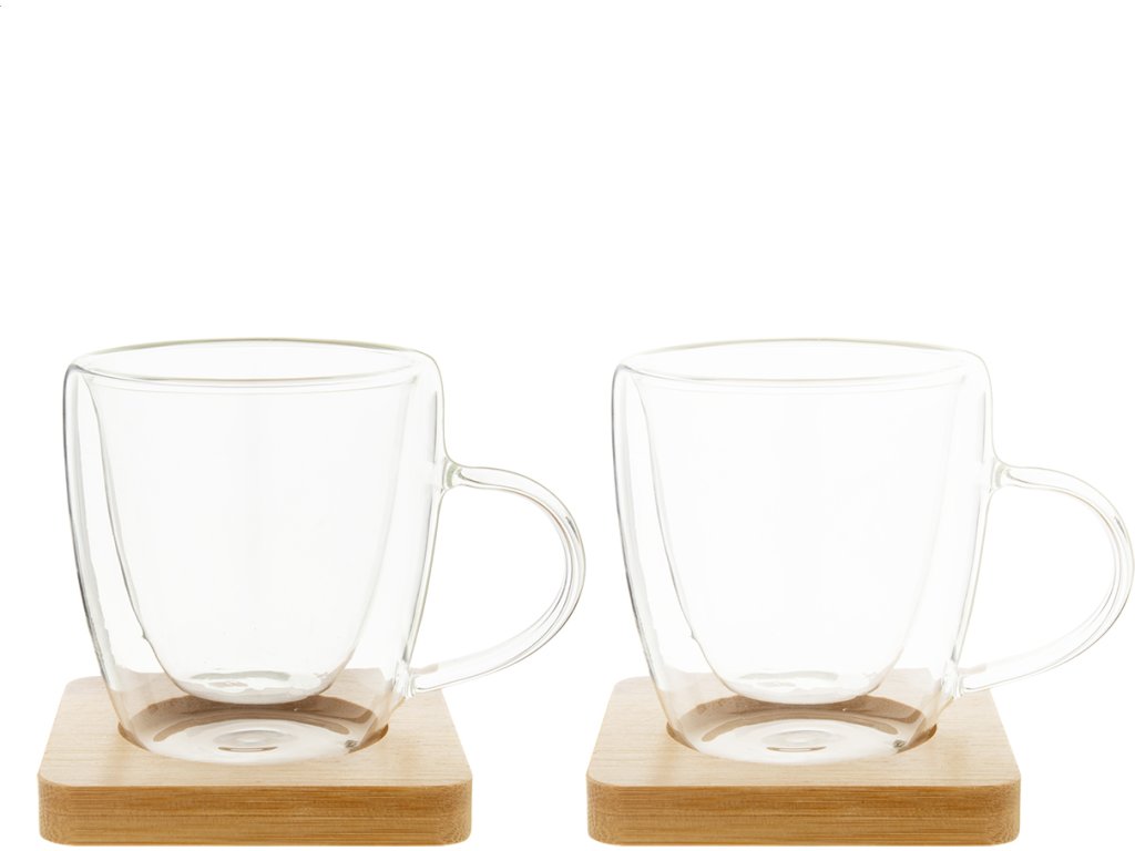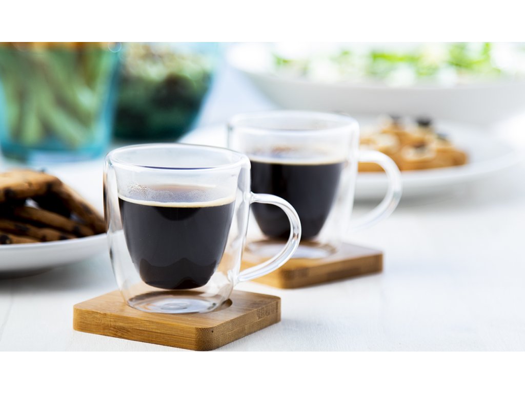 Sada šálků na espresso z borosilikátového skla s dvojitou stěnou, 2 ks šálků a bambusovými podšálky, 90 ml. V krabičce ze sulfátového papíru.